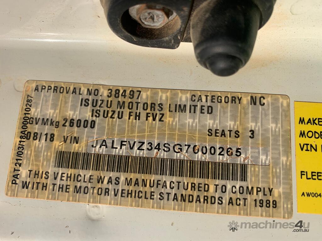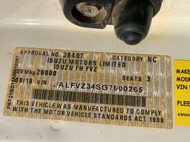 CP: 08/2018,Isuzu,FVZ 260-300,Service Body Day Cab,Automatic,Spring,Engine #: 6HK1212599,Isuzu 6HK1,8 Ltr,6 Cyl,Diesel,134118 (Kms. Showing on Odometer),Hourmeter not visible,Colour: White,Unregistered,VIN: JALFVZ34SG7000265,GVM: 26000,GCM: 36000,Sold with No Plates