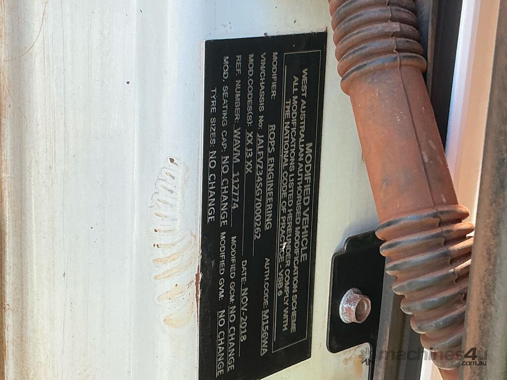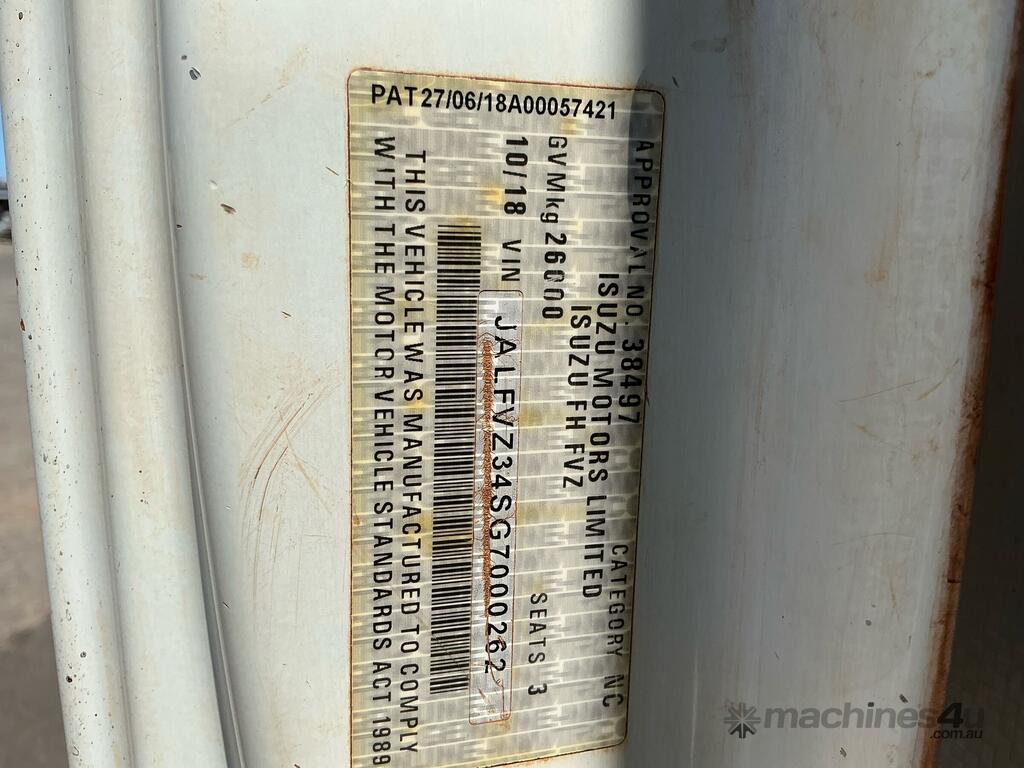 CP: 10/2018,Built: 10/2018,Isuzu,FVZ 260-300,Table Top,Automatic,Leaf,Engine #: 212538,6 Cyl,Diesel Turbo,278036 (Kms. Showing on Odometer),13802 (Hrs. Showing on Hour meter),Colour: White,Rego. No: NP(000262), Unregistered WA,VIN: JALFVZ34SG7000262,Key No: 589,Length: 9150 m,GVM: 26000,GCM: 36000,Sold with No Plates,Key No: 589