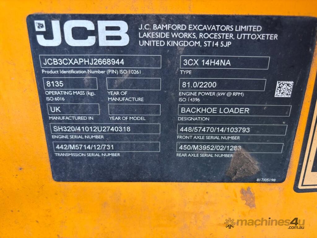 2018 JCB 3CX ROADRUNNER BACKHOE, 9400 HOURS, 110 HP, 6 SPEED TRANSMISSION WITH TORQUE LOCK, HYD HITCH AND GP BUCKET, EXTERDER HOE, HEAVY LIFT REAR END, 4 IN 1 LOADER BUCKET. GREAT MACHINE READY FOR SITE, LOCATED ADELIADE
