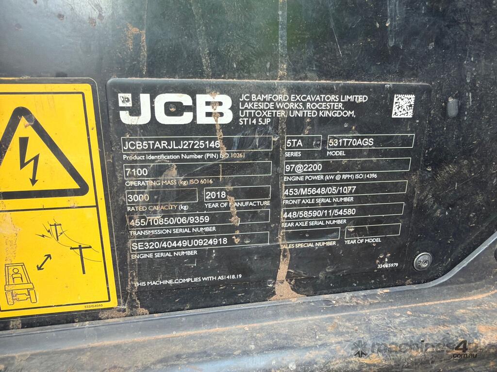 CP: CIRCA 2018,JCB,531-70,Telehandler,4 Cyl,Diesel Turbo,Odometer not visible,1686 (Hrs. Showing on Hour meter),Colour: Yellow,Unregistered,VIN: JCB5TARJL12725146,Serial No: NULL,Sold with No Plates,WOVR Status: WOVR N/A,Incident Type: Impact,Key No: 76