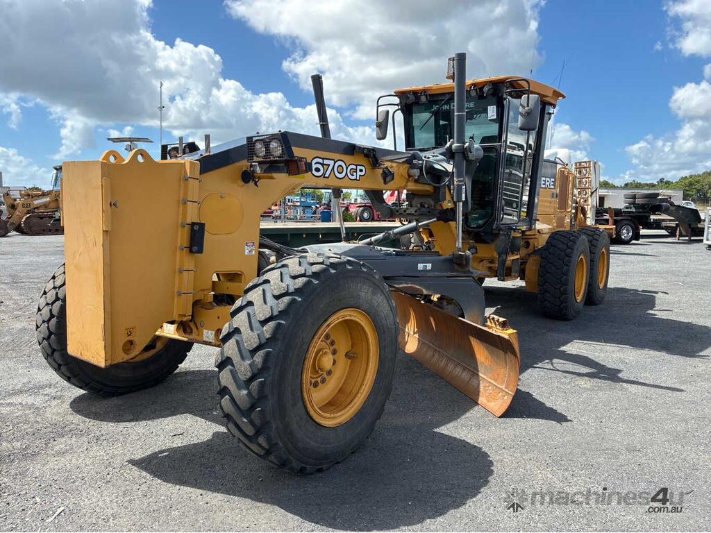 CP: CIRCA 2018,John Deere,670 GP,Grader,6 Cyl,Diesel,Odometer not visible,5917 (Hrs. Showing on Hour meter),Colour: Yellow,Unregistered,Serial No: 1DW670GPLHD685452,ROPS No: undefined,FOPS No: undefined,Sold with No Plates,Key No: 357