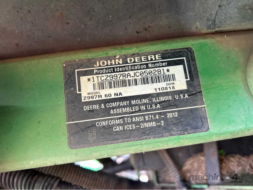 CP: CIRCA 2018,Built: 11/2018,John Deere,Z997R,Zero Turn Ride On Mower,Engine #: CH3Y17D047,3 Cyl,Diesel,Odometer not visible,2712 (Hrs. Showing on Hour meter),Colour: Green,Rego. No: NP(CD64DE), Unregistered NT,VIN: 1TCZ997RAJC050281,Serial No: 1TCZ997RAJC050281,ROPS No: undefined,Sold with No Plates