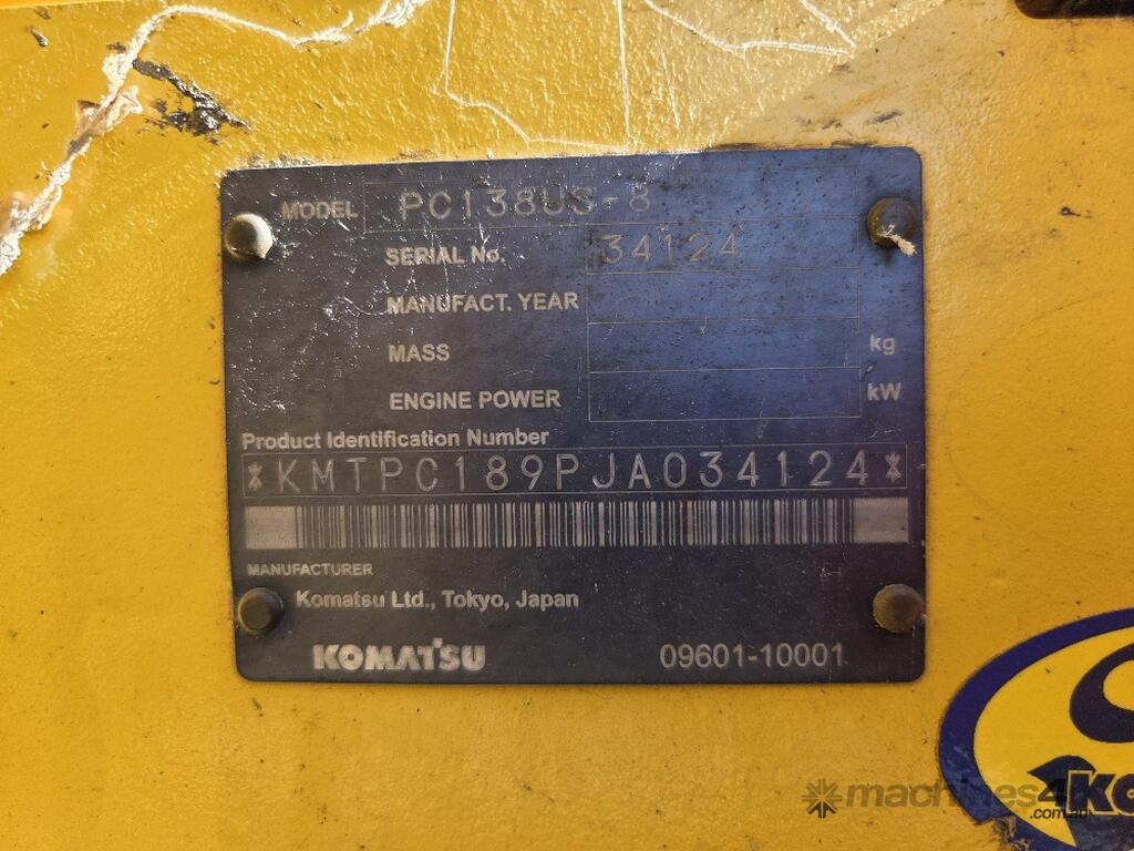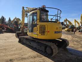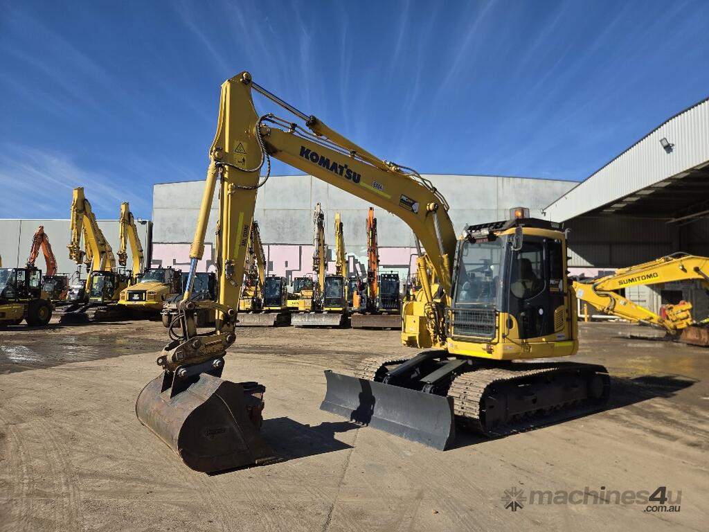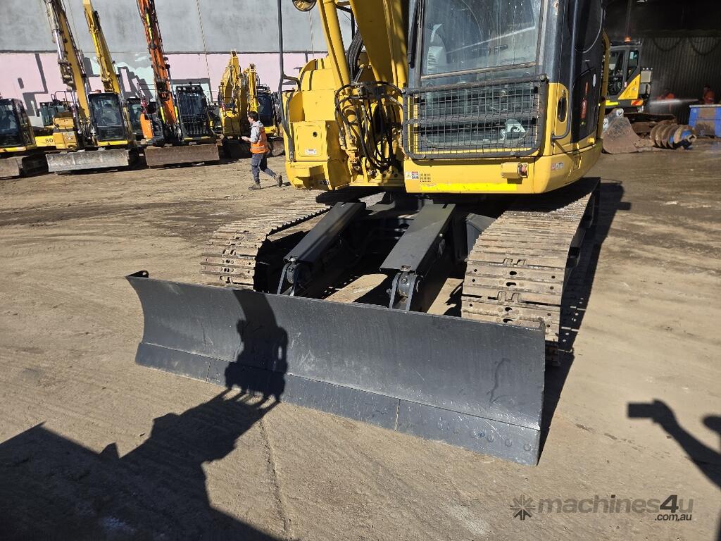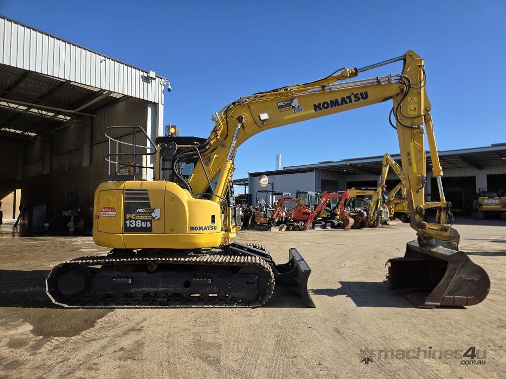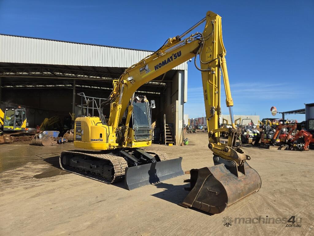 USED 2018 KOMATSU PC138US-8 15T EXCAVATOR WITH REDUCED RADIUS TAIL, LOW 3376 HOURS, DOZER BLADE, STEEL TRACKS, HYDRAULIC HITCH, FULL A/C CABIN WITH ROPS, TWO WAY FLOW AUXILIARY HYDRAULICS, REAR VIEW CAMERA, SAFETY HANDRAILS, CHECK VALVES, UHF RADIO, E-STOPS, FULL CIVIL SPEC, GP AND MUD BUCKET.