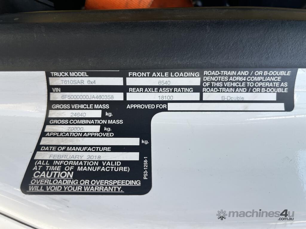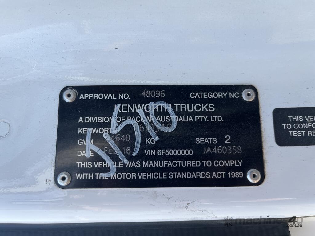 CP: 02/2018,Built: 02/2018,Kenworth,T610SAR,Prime Mover Day Cab,Manual,Airbag,Engine #: 80019887,Cummins X15,6 Cyl,Diesel Turbo,18 Gears,1554550 (Kms. Showing on Odometer),26107 (Hrs. Showing on Hour meter),Colour: White,Rego. No: NP(XB68PM), Unregistered NAT,VIN: 6F5000000JA460358,GVM: 24640,GCM: 70000,Sold with No Plates