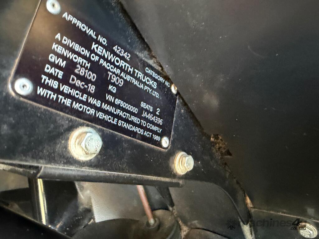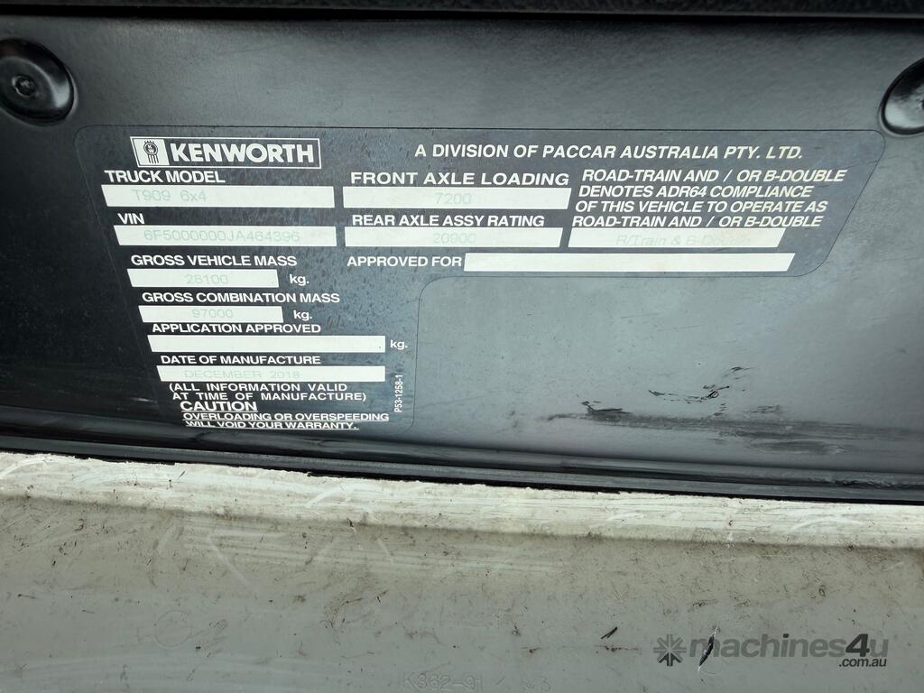 CP: 12/2018,Kenworth,T909,Prime Mover Sleeper Cab,Manual,Airbag Suspension ,Engine #: 80698984,2024 Cummins ISX X15,6 Cyl,Diesel,Intercooler Turbo,18 Gears,467650 (Kms. Showing on Odometer),23727 (Hrs. Showing on Hour meter),Colour: White,Unregistered,VIN: 6F5000000JA464396,GVM: 28100,GCM: 97000,Sold with No Plates