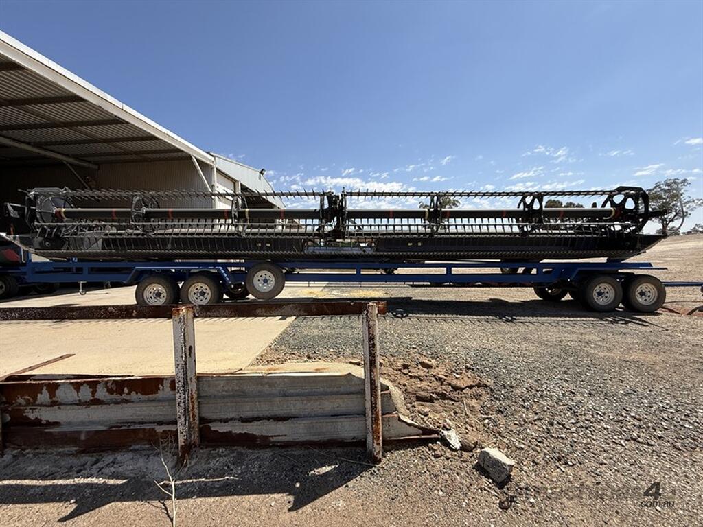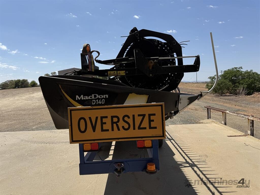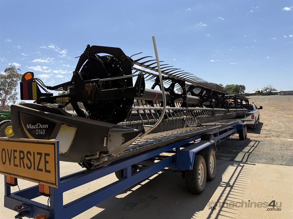 2018 MACDON D140 DRAPER FRONT, serial no. 328447-18. 40-foot front fitted with finger tine reel. New stainless steel skid plates fitted, with feed deck skid shoes replaced within the last 200 hours. Gauge wheel pins and bushes, RTD drive chain, left-hand draper wobble box in and out seals have all been replaced. The float lock has been repaired and a new float spring fitted. Belts are in good condition. Unit has completed the 2025 season. Good, straight, and well-maintained front. Note: Comb trailer is not