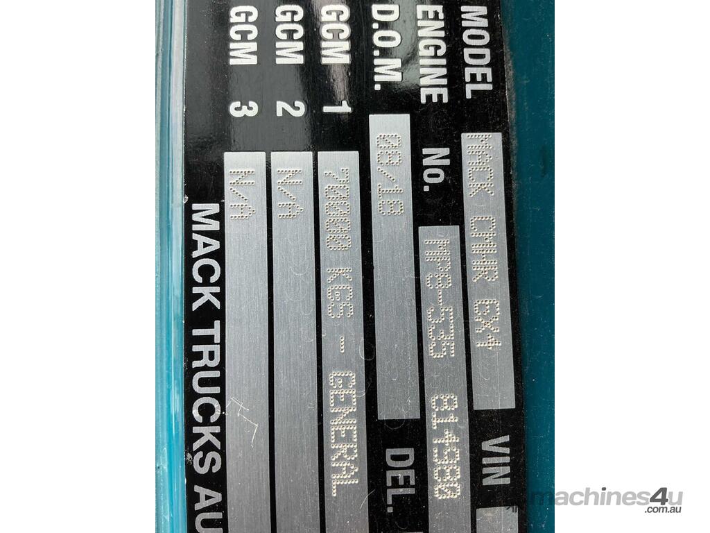 CP: 08/2018,Mack,Tipper & Quad Dog Combination,Automatic,Airbags,Engine #: 814980,MP8,6 Cyl,Diesel Turbo,1233390 (Kms. Showing on Odometer),24203 (Hrs. Showing on Hour meter),Colour: Blue,Unregistered,VIN: 6FMM12H83JD809892,Key No: 462E,Length: 7.7 M,GVM: 27600,GCM: 70000,Sold with No Plates,Key No: 462E