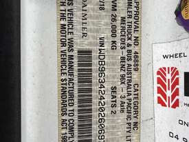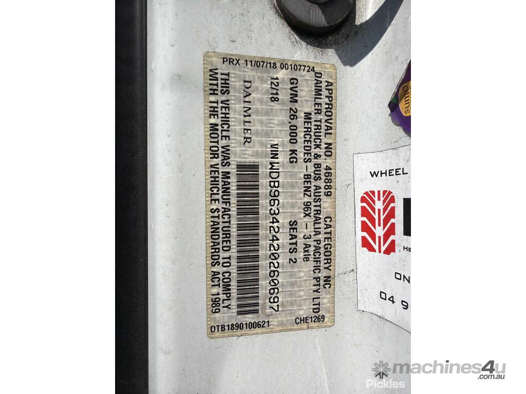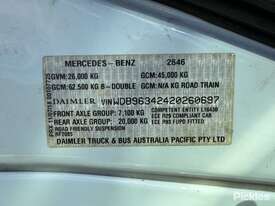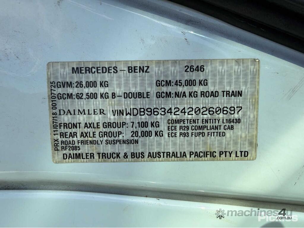 CP: 12/2018,Mercedes Benz,Actros 2646,Prime Mover Day Cab,Automatic,Airbag,6 Cyl,Diesel Turbo,804295 (Kms. Showing on Odometer),16854 (Hrs. Showing on Hour meter),Colour: White,Unregistered,VIN: WDB0697,Key No: 335E,Length: 7 m,GVM: 26000,GCM: 62500,Sold with No Plates,Key No: 335E