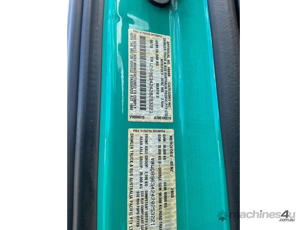 CP: 06/2018,Mercedes Benz,Actros 2658,Prime Mover,Automatic,Air Bag Suspension,6 Cyl,Diesel,1039314 (Kms. Showing on Odometer),13324 (Hrs. Showing on Hour meter),Colour: Green,Rego. No: NP(1ND2HF), Unregistered VIC,VIN: WDB3221,Key No: 21,GVM: 26000,GCM: 90000,Sold with No Plates,Key No: 21