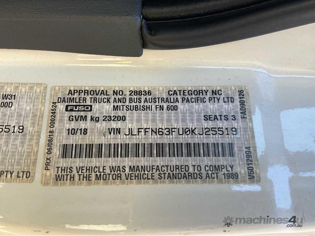 CP: 10/2018,Mitsubishi,FN600,Curtain Sider,Automatic,Airbag,Odometer not visible,Hourmeter not visible,Colour: White,Rego. No: XN37FP NAT,VIN: JLFFN63FU0KJ25519,GVM: 23200,GCM: 32000,Sold with No Plates
