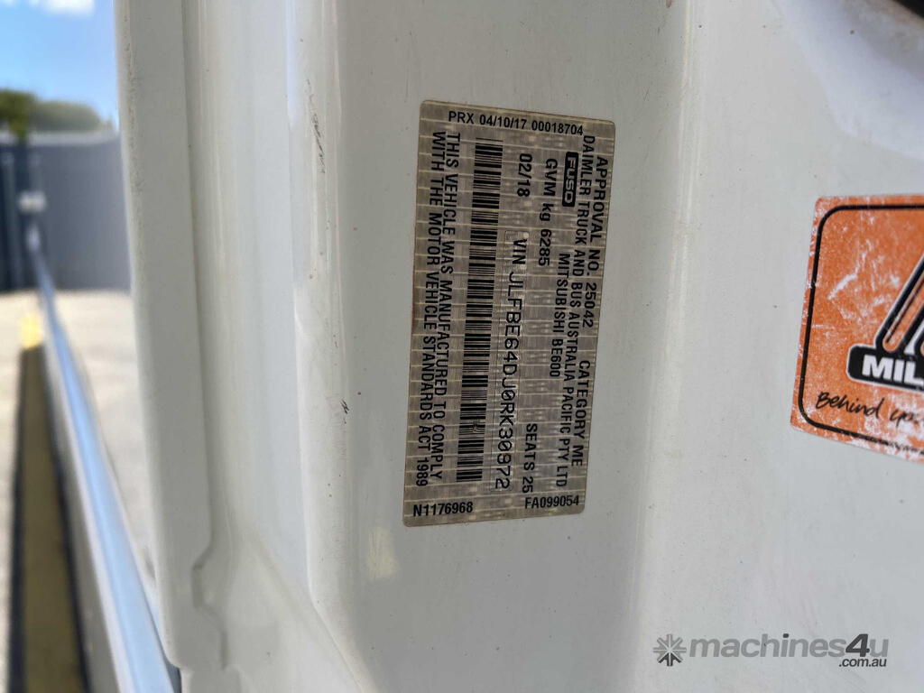 CP: 02/2018,Mitsubishi,Fuso BE600 Rosa,25 Seat Bus,Automatic,Spring ,4 Cyl,Diesel,183193 (Kms. Showing on Odometer),Hourmeter not visible,Colour: White,Unregistered,VIN: JLFBE64DJ0RK30972,Key No: P95,Length: 7.8 m,GVM: 6285,Sold with No Plates,Key No: P95