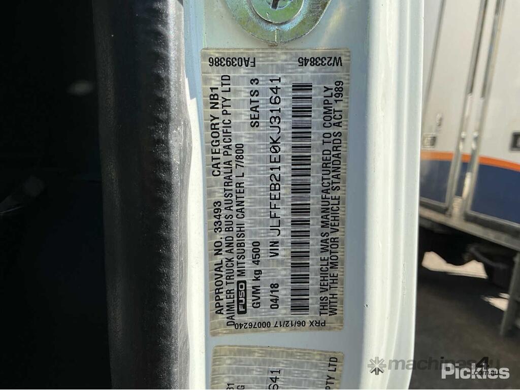 CP: 04/2018,Mitsubishi Fuso,Canter 515,Pantech (Day Cab),Automatic,Leaf Spring Suspension ,4 Cyl,Diesel Turbo,Odometer not visible,Hourmeter not visible,Colour: White,Rego. No: NP(1GOP370), Unregistered WA,VIN: JLFFEB21E0KJ31641,Length: 6.1 m,GVM: 4500,GCM: 8000,Sold with No Plates,WOVR Status: Statutory Write-Off,Incident Type: Impact