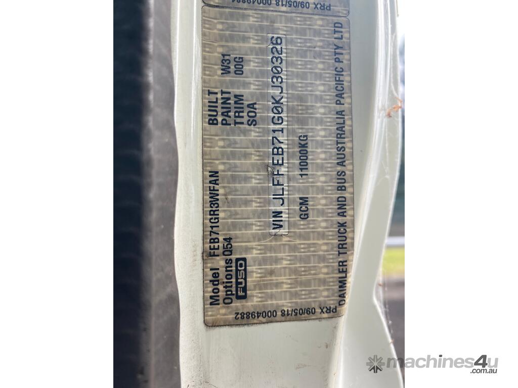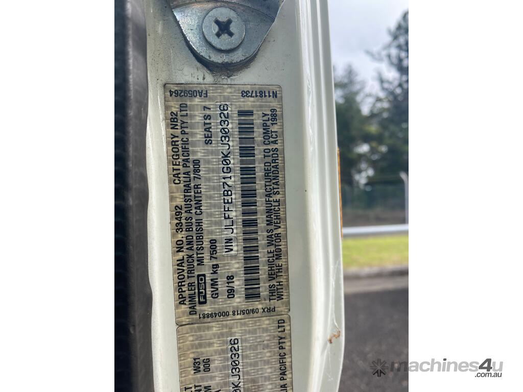CP: 09/2018,Built: 09/2018,Mitsubishi Fuso,Canter 815,Crew Cab Table Top,Automatic,Spring,Engine #: 4P10D36587,4 Cyl,Diesel Turbo,17451 (Kms. Showing on Odometer),Hourmeter not visible,Colour: White,Unregistered,VIN: JLFFEB71G0KJ30326,Length: 4 M,GVM: 7500,GCM: 11000,Sold with No Plates
