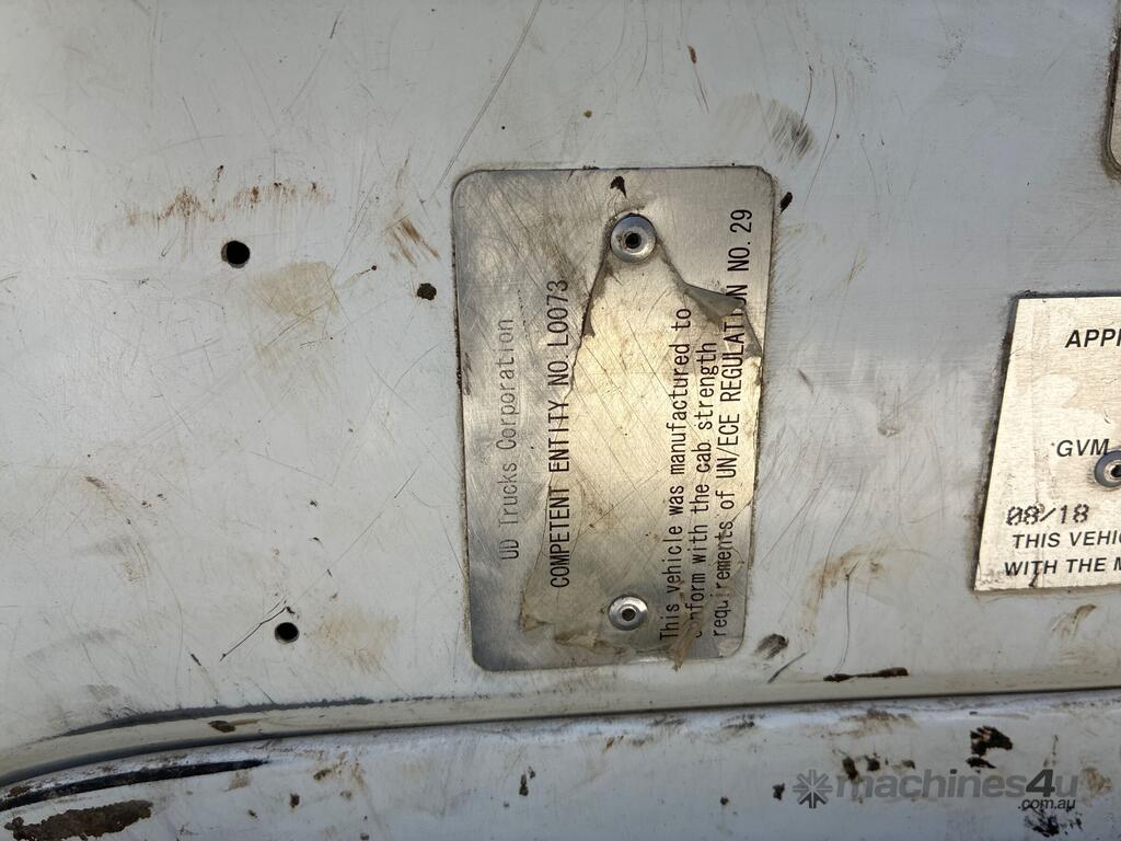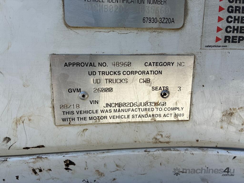 CP: 08/2018,Nissan UD,Quon CW26 390,Aggregate Loader,Automatic,Spring Suspension,Diesel,Turbo,60824 (Kms. Showing on Odometer),4642 (Hrs. Showing on Hour meter),Colour: White,Rego. No: NP(XV28JO), Unregistered NAT,VIN: JNCMB02D6JU035660,GVM: 26000,GCM: 50000,Sold with No Plates