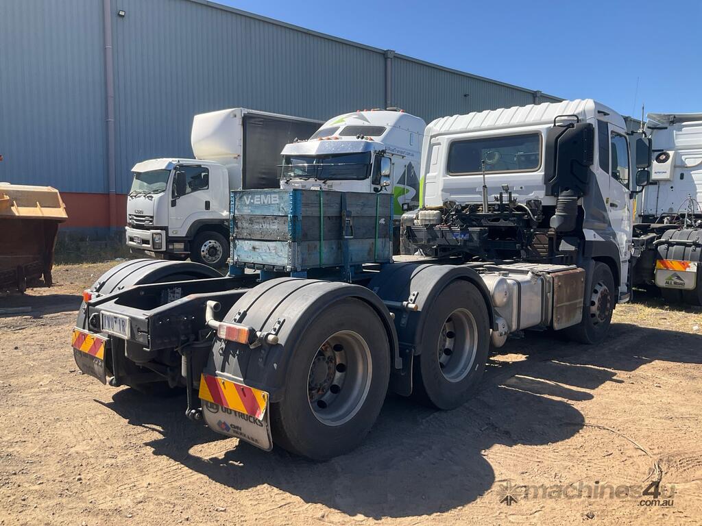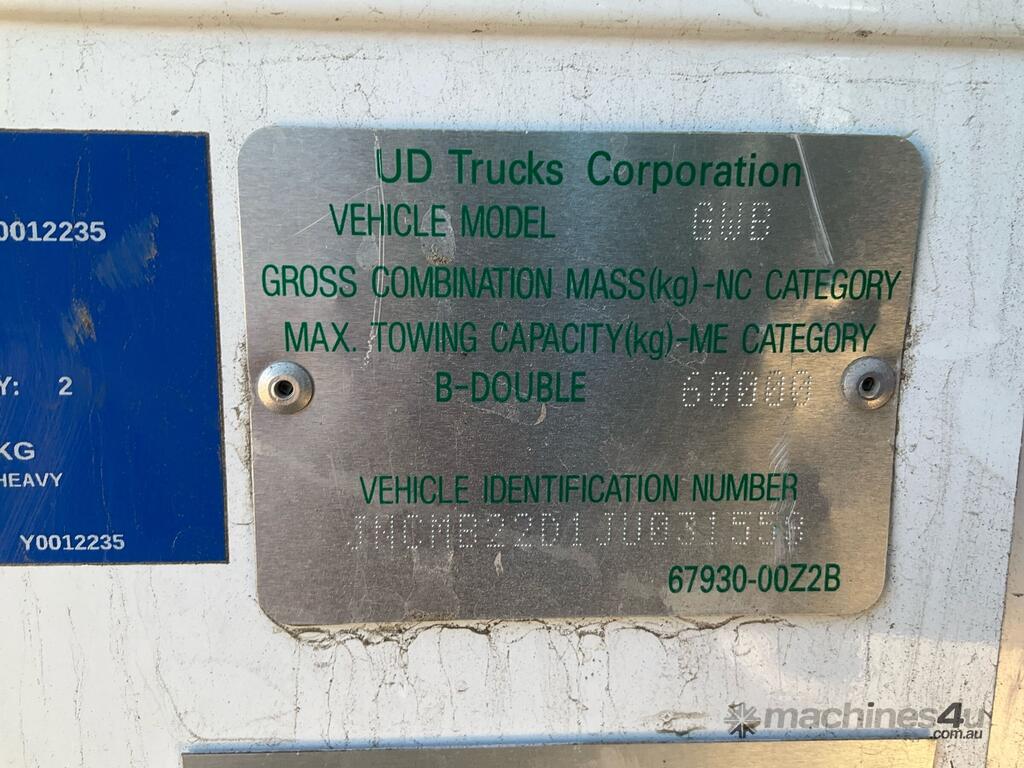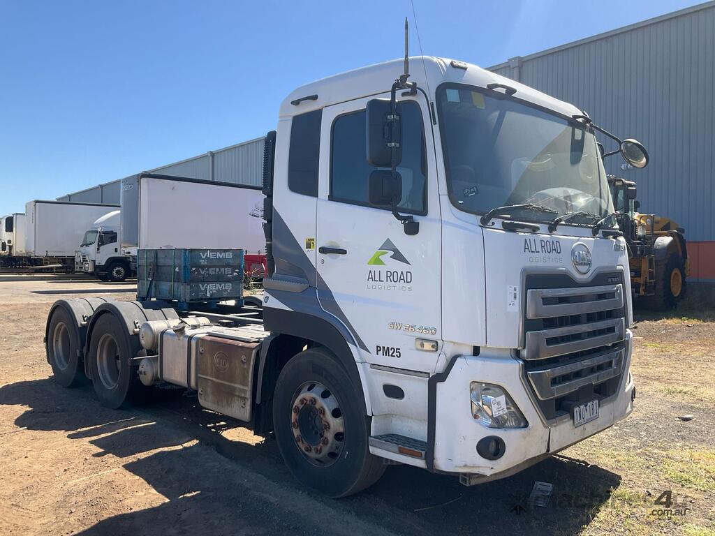CP: 04/2018,Nissan UD,Quon GW26 460,Prime Mover,Automatic,Air Bag Suspension,6 Cyl,Diesel,574366 (Kms. Showing on Odometer),Hourmeter not visible,Colour: White,Rego. No: NP(1NU1RI), Unregistered VIC,VIN: JNCMB22D1JU031558,GVM: 26000,GCM: 60000,Sold with No Plates