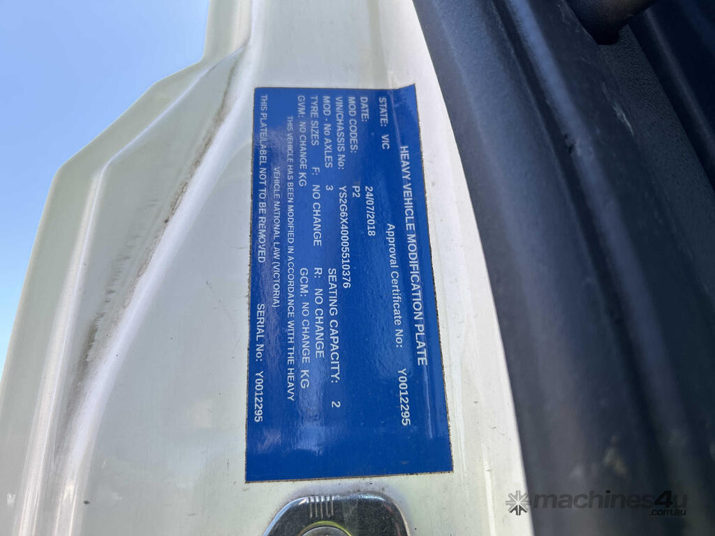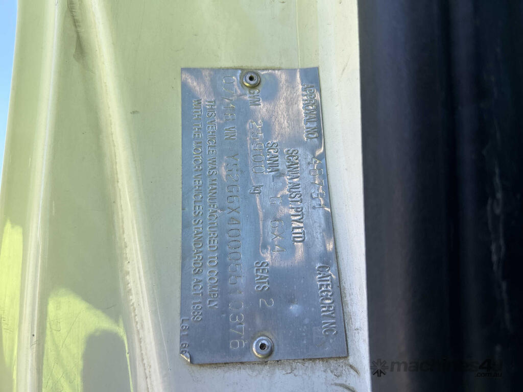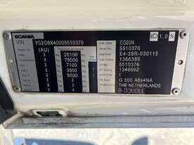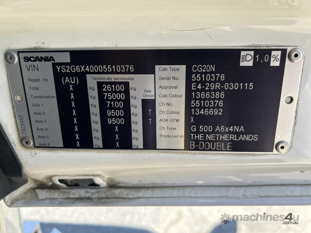 CP: 07/2018,Scania,G500,Prime Mover,Automatic,Airbag,6 Cyl,Diesel Turbo,836152 (Kms. Showing on Odometer),20924 (Hrs. Showing on Hour meter),Colour: White,Rego. No: NP(XS94DY), Unregistered SA,VIN: YS2G6X6,Key No: P179,Length: 6.7 m,GVM: 26100,GCM: 75000,Sold with No Plates,Key No: P179