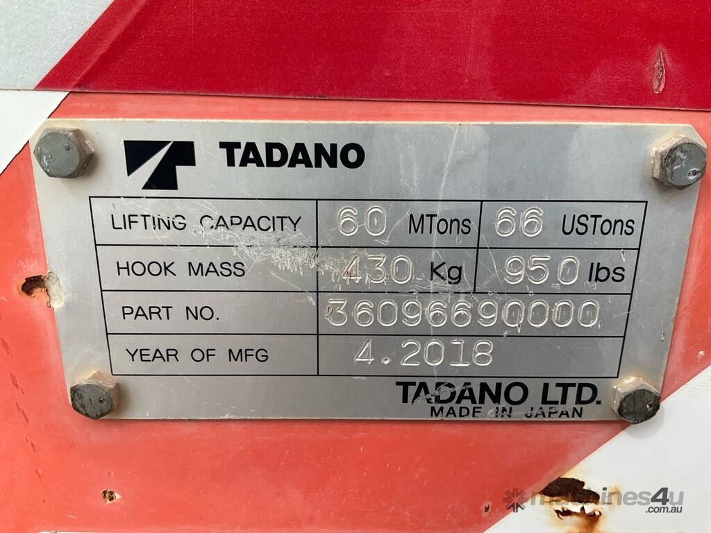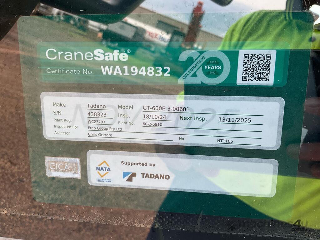 CP: CIRCA 2018,Tadano,GT-600E-3,All Terrain Crane,Engine #: 0M457LA,6 Cyl,Diesel,31341 (Kms. Showing on Odometer),4044 (Hrs. Showing on Hour meter),Colour: White,Unregistered,VIN: JTX4256C0J0438323,Serial No: 438323,Sold with No Plates