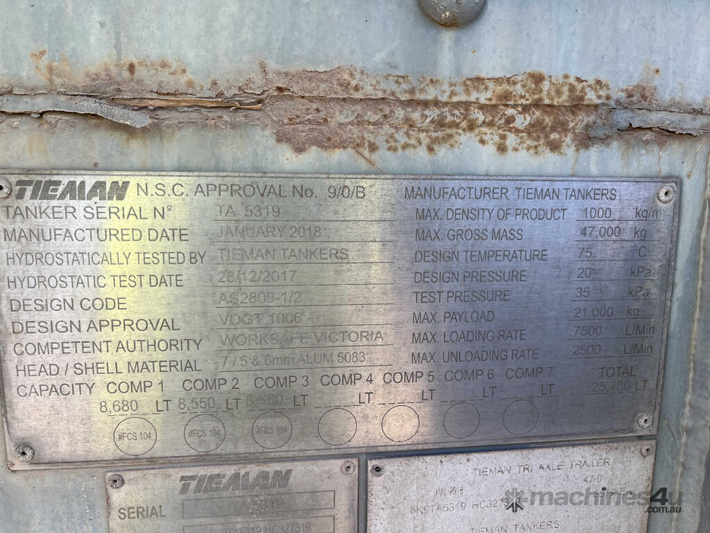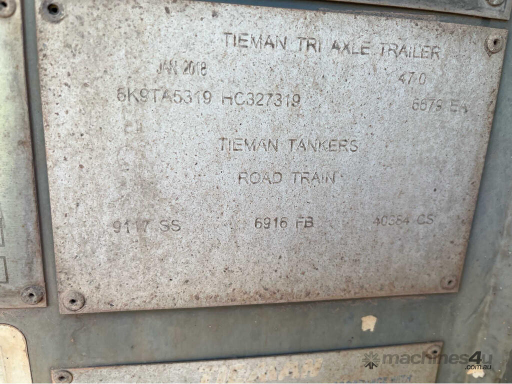 CP: 01/2018,Built: 01/2018,Tieman,Tri Axle Tanker,Tri Axle Tanker Lead Trailer,74718 (Kms. Showing on Hubometer),Colour: White,Rego. No: 1TTA818 WA,VIN: 6K9TA5319HC327319,Sold with No Plates