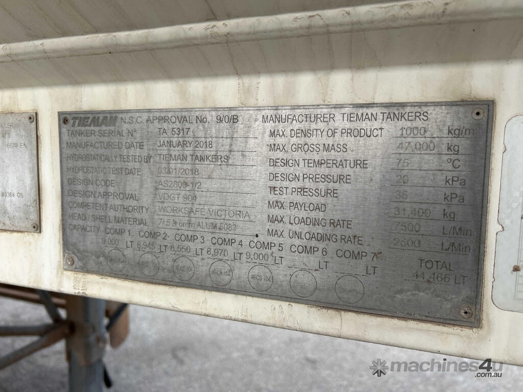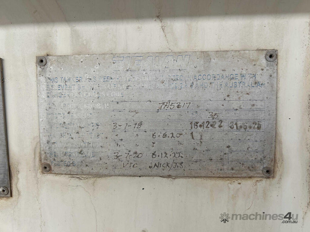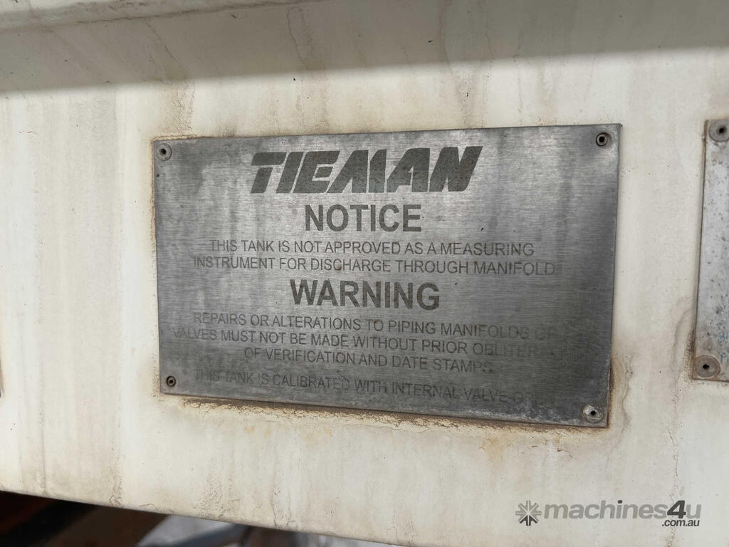 CP: 01/2018,Built: 01/2018,Tieman,Tri Axle Tanker,Tri Axle Tanker Trailer,Hubometer not visible,Colour: White,Rego. No: NP(1TTA816), Unregistered WA,VIN: 6K9TA5317HC327317,Sold with No Plates