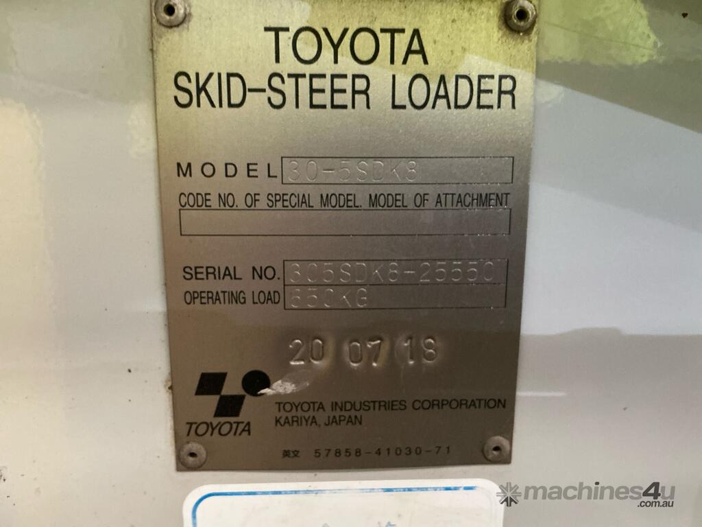 CP: 07/2018,Built: 07/2018,Toyota,Huski 30-5SDK8,Skid Steer,4 Cyl,Diesel,Odometer not visible,2220 (Hrs. Showing on Hour meter),Colour: Grey,Unregistered,Serial No: 305SDK8-25550,Sold with No Plates