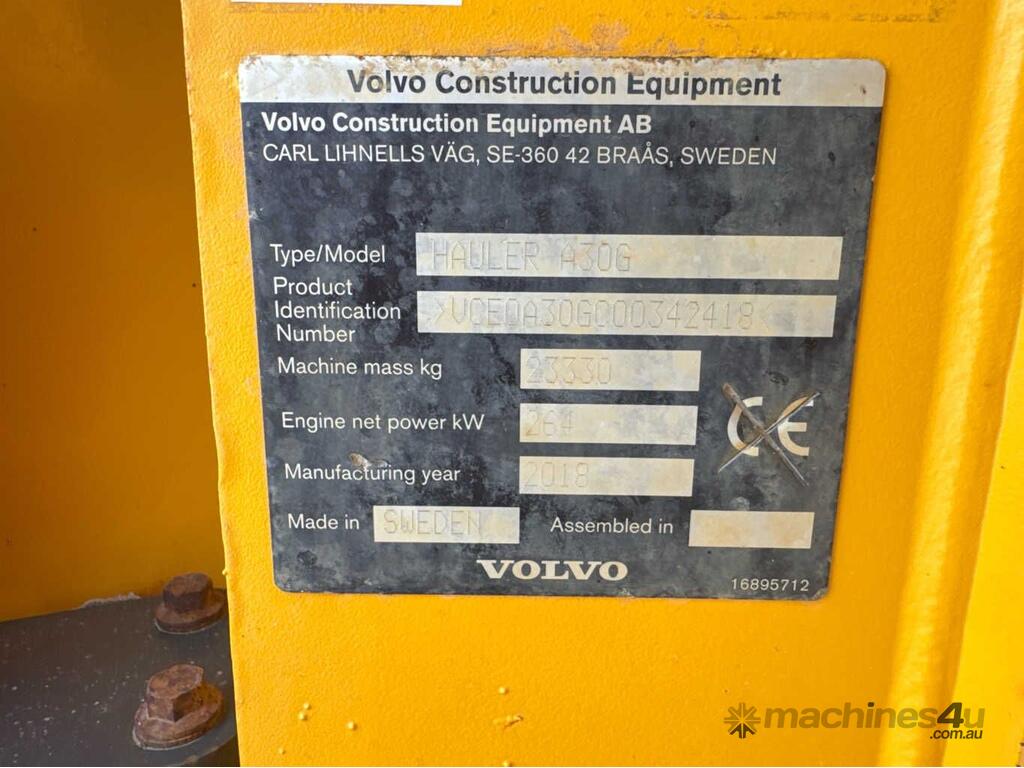 CP: CIRCA 2018,Built: 01/2018,Volvo,A30E,Articulated Dump Truck,10.8 Ltr,6 Cyl,Diesel,Turbo,Odometer not visible,11285 (Hrs. Showing on Hour meter),Colour: Yellow,Unregistered,VIN: VCE0A30GC00342418,Sold with No Plates