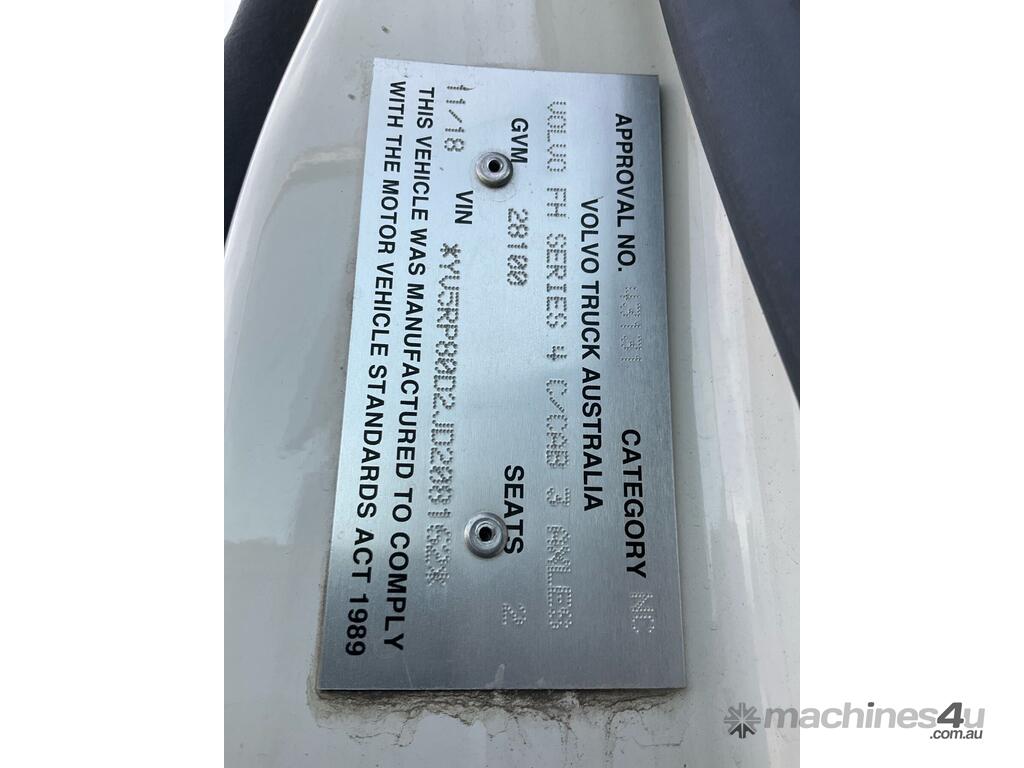 CP: 11/2018,Volvo,FH16,Prime Mover Sleeper Cab,Automatic,Air Bag Suspension,Engine #: 118561,Volvo D16,6 Cyl,Diesel,1386034 (Kms. Showing on Odometer),20853 (Hrs. Showing on Hour meter),Colour: White,Rego. No: XV70JG VIC,VIN: YV5RP80D2JD208162,Key No: 28,GVM: 28100,GCM: 70000,Sold with No Plates,Key No: 28