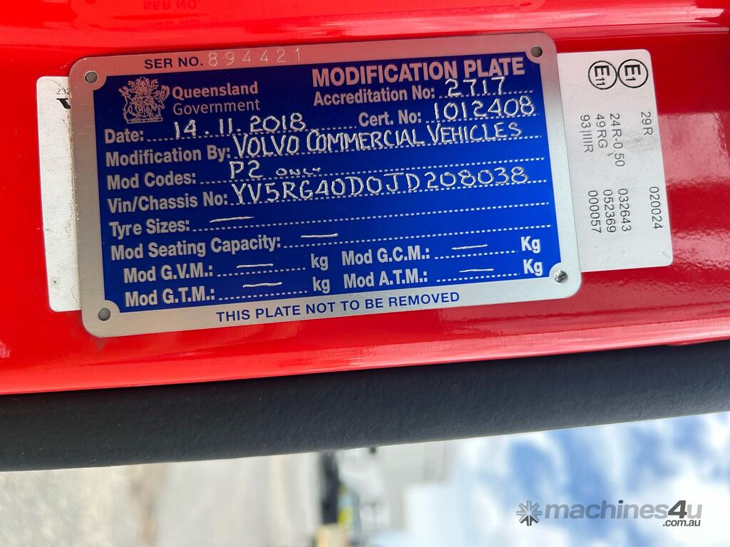 CP: 10/2018,Volvo,FH540,Prime Mover,Automatic,Airbag,6 Cyl,Diesel,1169512 (Kms. Showing on Odometer),17148 (Hrs. Showing on Hour meter),Colour: Red,Rego. No: XQ55EA,VIN: YV5RG40D0JD208038,Key No: 201,GVM: 28100,GCM: 70000,Sold with No Plates,Key No: 201
