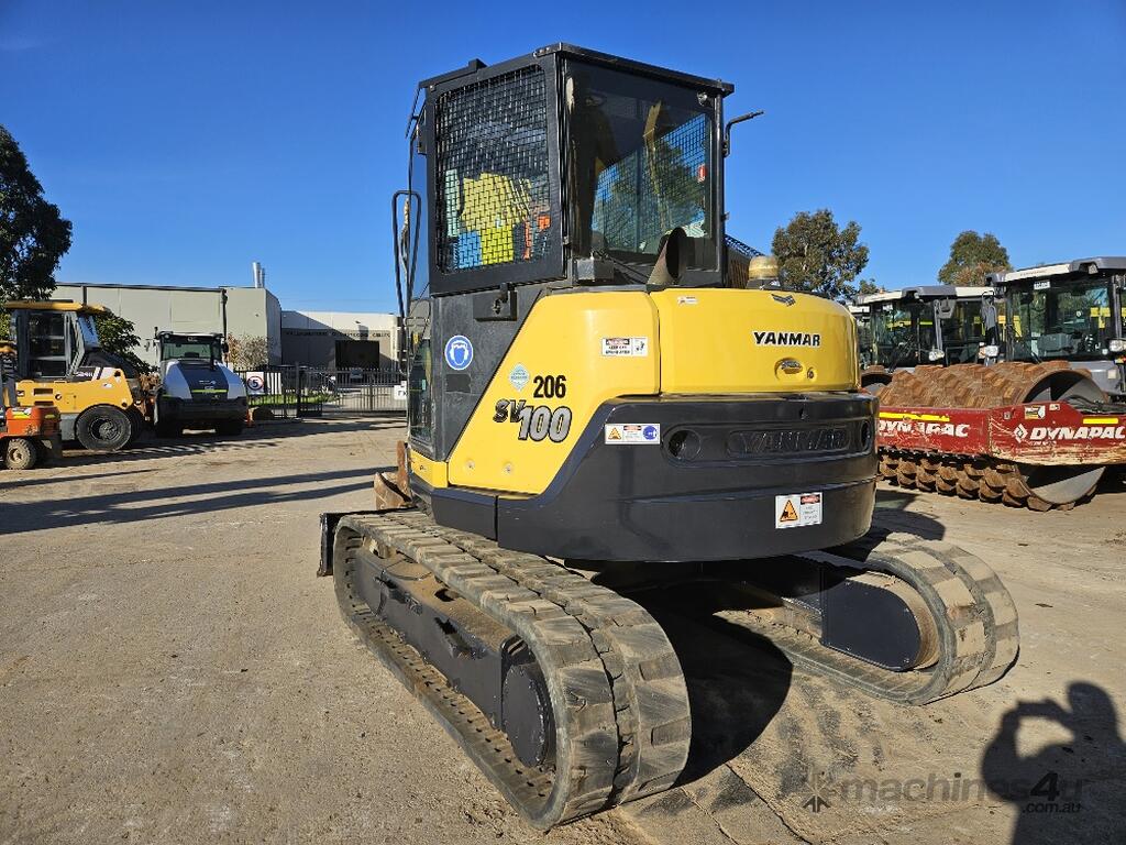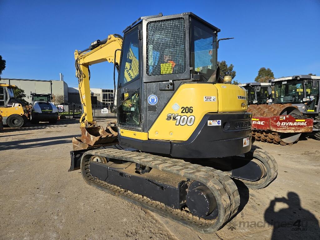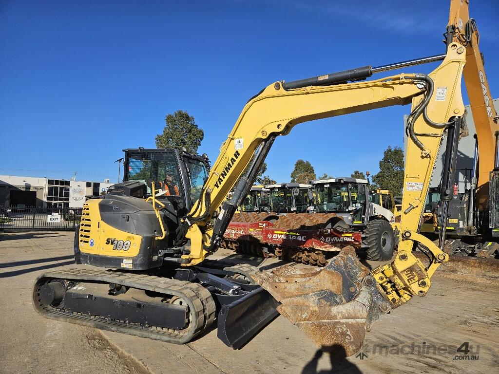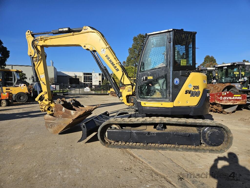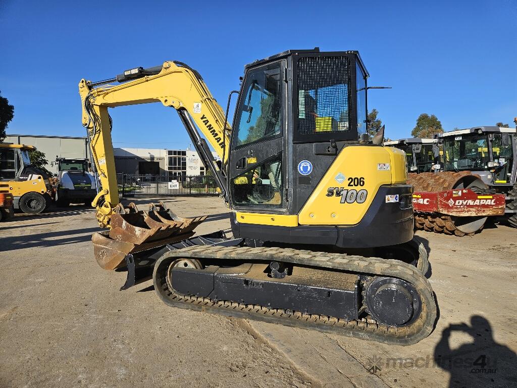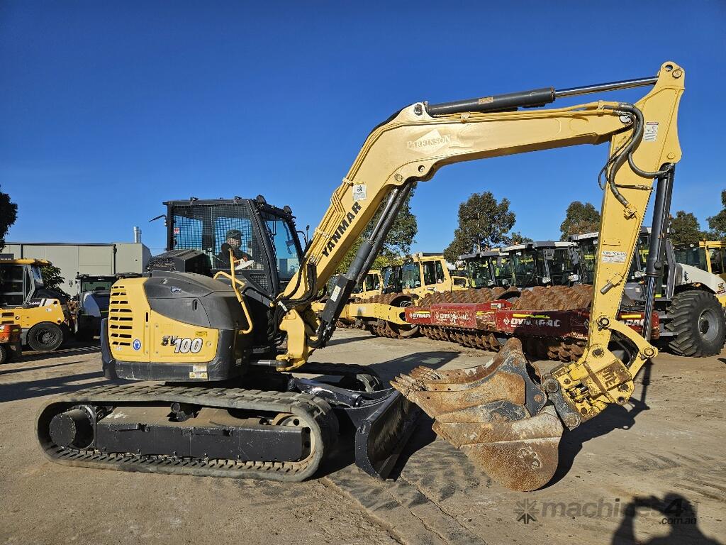 2018 YANMAR SV100-2 EXCAVATOR WITH AME TILTING HITCH, 3316 HRS, FULL CIVIL SPEC WITH UHF RADIO, SAFETY BEACON, 10t OPERATING WEIGHT, REDUCED TAIL SWING, RUBBER TRACKS, SWIVEL BOOM, FULL A/C CABIN WITH ROPS, DOZER BLADE, AUXILIARY HYDRAULICS WITH PROPORTIONAL CONTROLS, AUTO IDLE FUNCTION, TRAVEL ALARMS, HYDRAULIC TILTING QUICK HITCH, 450 & 600mm DIG BUCKETS AND MUD BUCKET. ALUMINIUM VANDAL COVERS, RISK ASSESSMENT, FULLY SERVICED AND READY TO WORK. AUSTRALIAN DELIVERED JANUARY 2019, 3-MONTH DRIVETRAIN WARRANTY