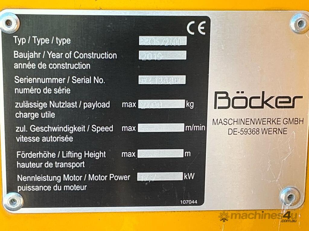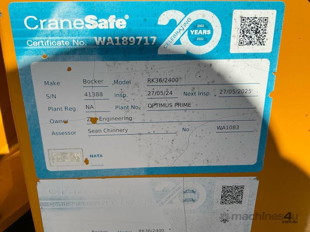 CP: CIRCA 2019,Built: 01/2019,Bocker,RK 36/2400,Crawler Crane,3 Cyl,Diesel,Odometer not visible,675 (Hrs. Showing on Hour meter),Colour: Yellow,Unregistered,Serial No: 41388,Sold with No Plates
