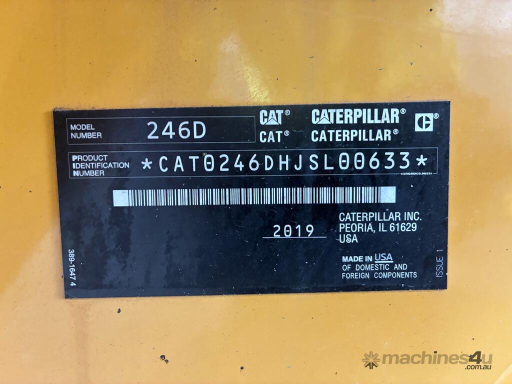 CP: CIRCA 2019,Caterpillar,246D,Wheeled Skid Steer,4 Cyl,Diesel,Odometer not visible,2193 (Hrs. Showing on Hour meter),Colour: Yellow,Unregistered,Serial No: CAT0246DHJSL00633,Sold with No Plates,Key No: 170