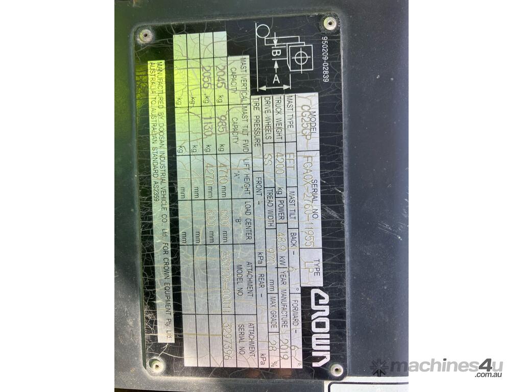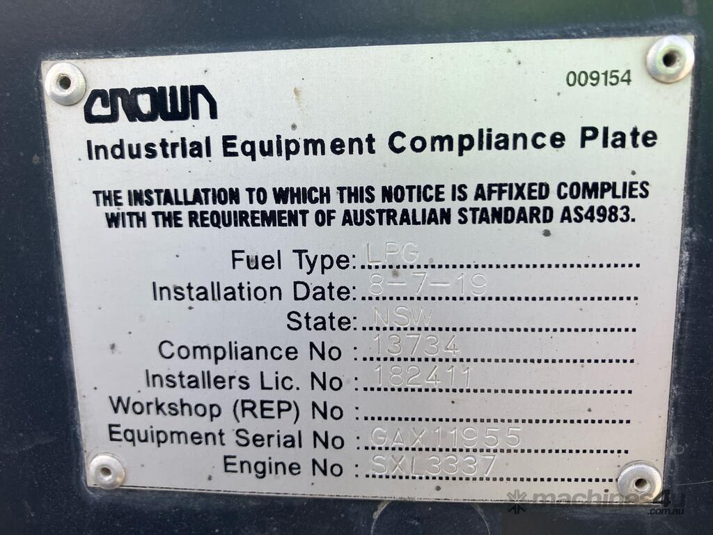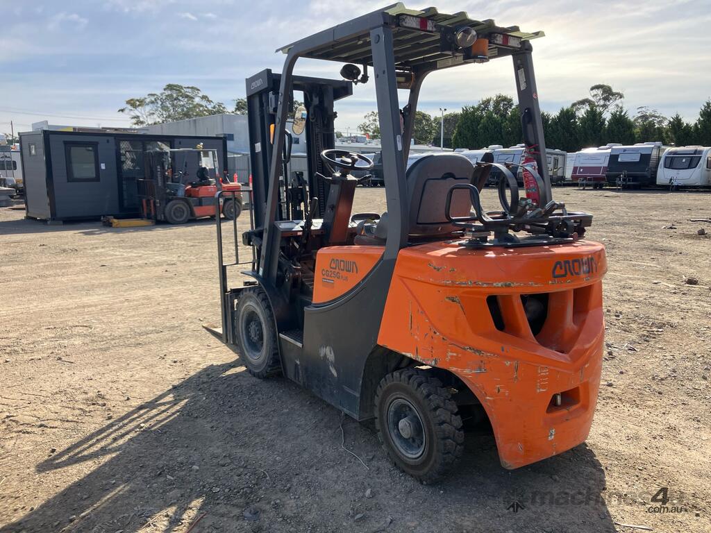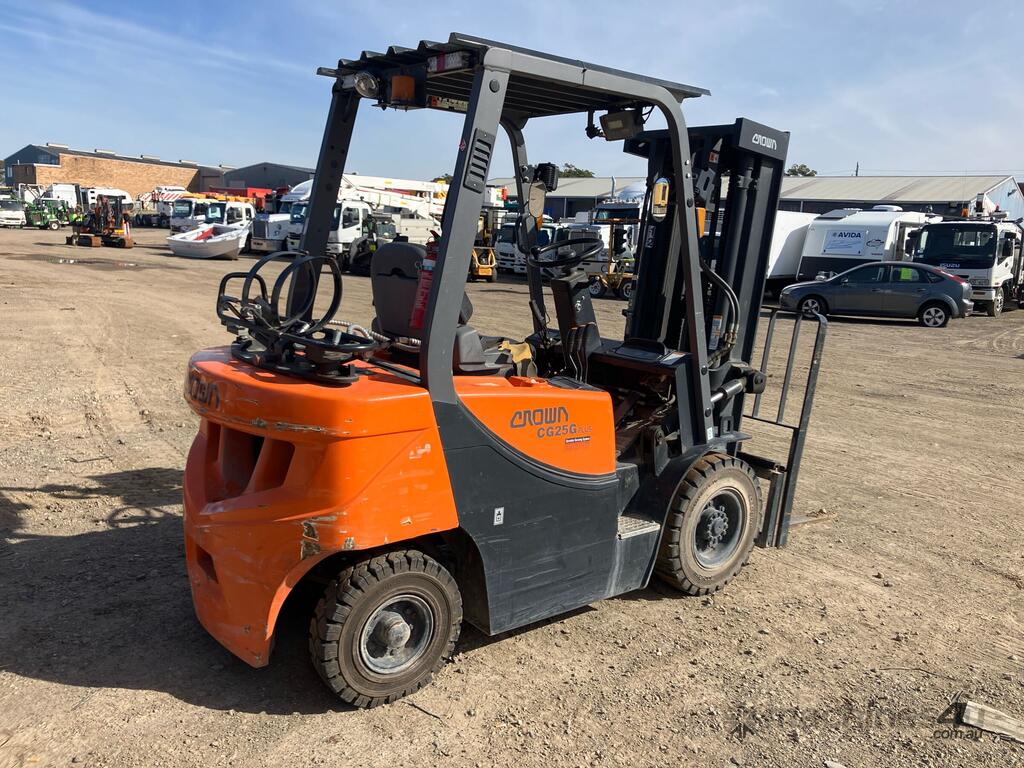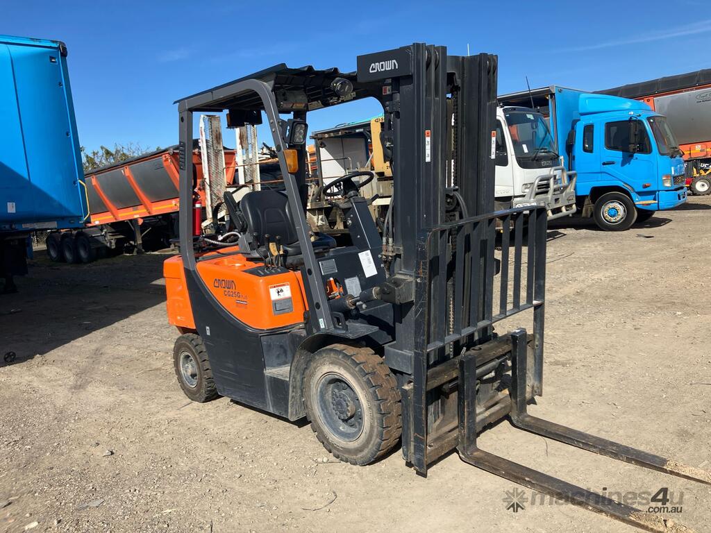 CP: CIRCA 2019,Built: 01/2019,Crown,CG25GP,Forklift,Gas,Odometer not visible,1500 (Hrs. Showing on Hour meter),Colour: Orange,Rego. No: NP(GA0X11955), Unregistered,Serial No: FGAOX,Sold with No Plates