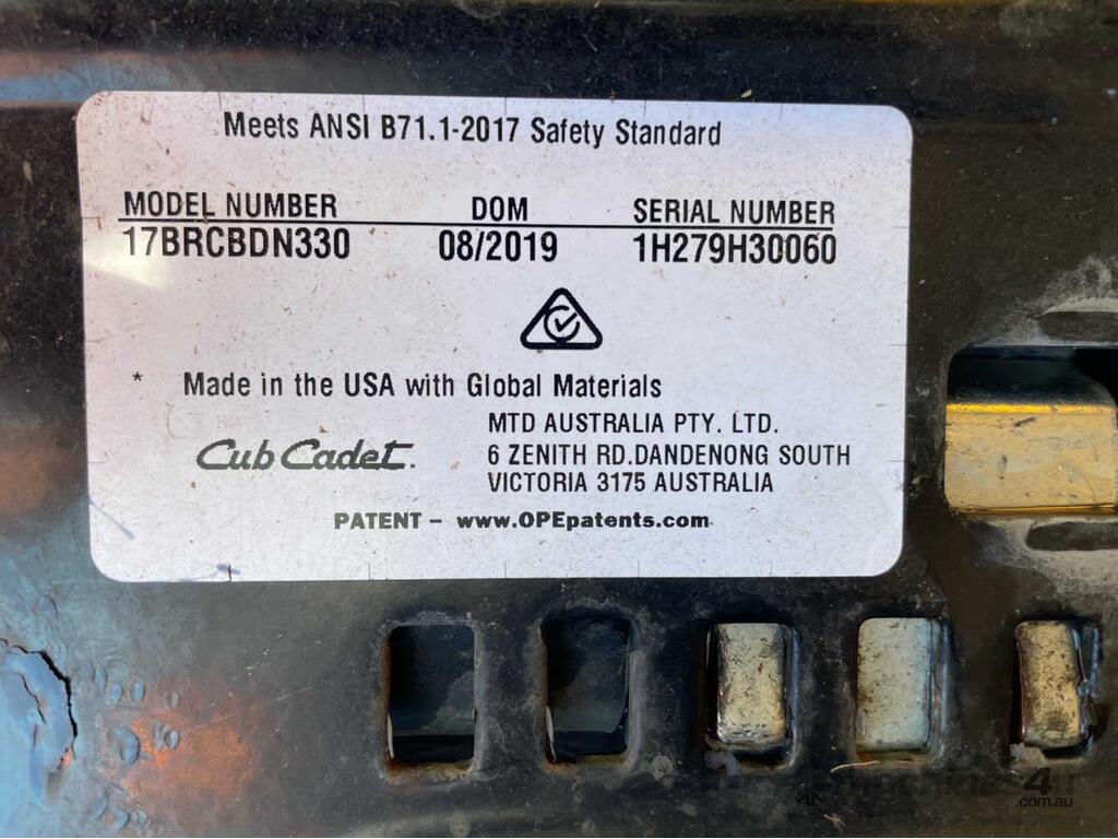 CP: 08/2019,Cub Cadet,RZT S 46,Zero Turn Ride On Mower,Engine #: ,726 CC,2 Cyl,Petrol,Odometer not visible,162 (Hrs. Showing on Hour meter),Colour: Yellow,Unregistered,Serial No: 1H279H30060,Sold with No Plates,Key No: 258E