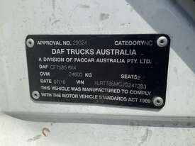 CP: 07/2019,DAF,CF7585,Prime Mover,Automatic,Air Bag,6 Cyl,Diesel,882356 (Kms. Showing on Odometer),Hourmeter not visible,Colour: White,Unregistered,VIN: XLRTT85MCJG247203,Key No: 282,GVM: 24600,GCM: 70000,Sold with No Plates,Key No: 282