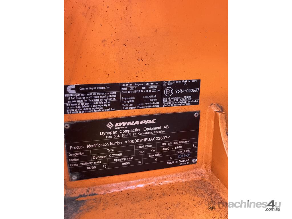 2019 DYNAPAC CC2200 twin smooth drum asphalt vibrating roller approx 2900 hrs, Cummins turbo diesel engine EX GOVT NSW ROADS , level 3 compliant , reverse cameras , seat and park brake alarms , UHF and stereo AIR COND , very today cab ROPS protection , window tint VERY good order and ready for work $68,900 plus GST