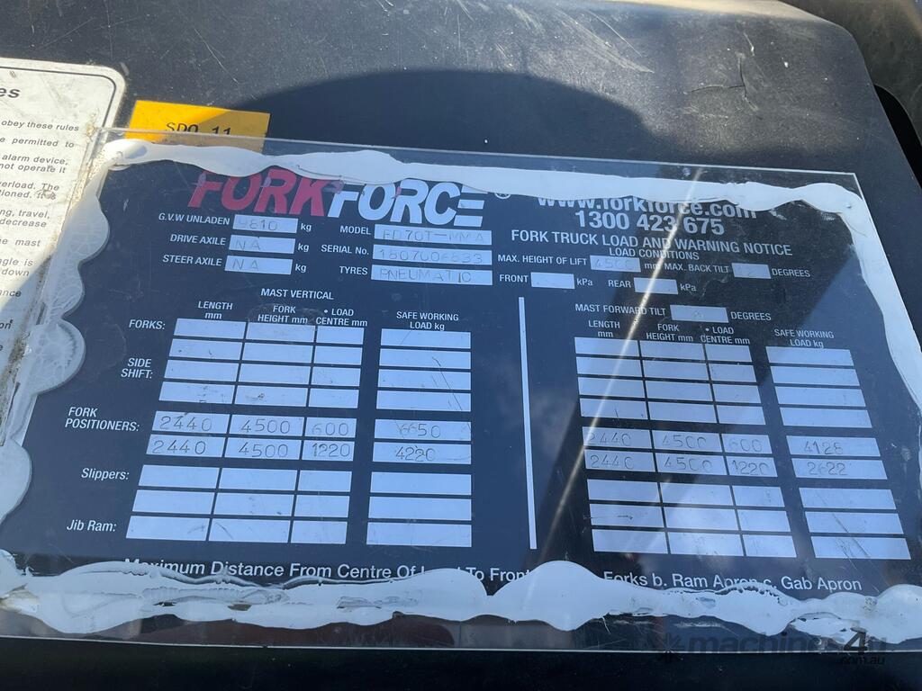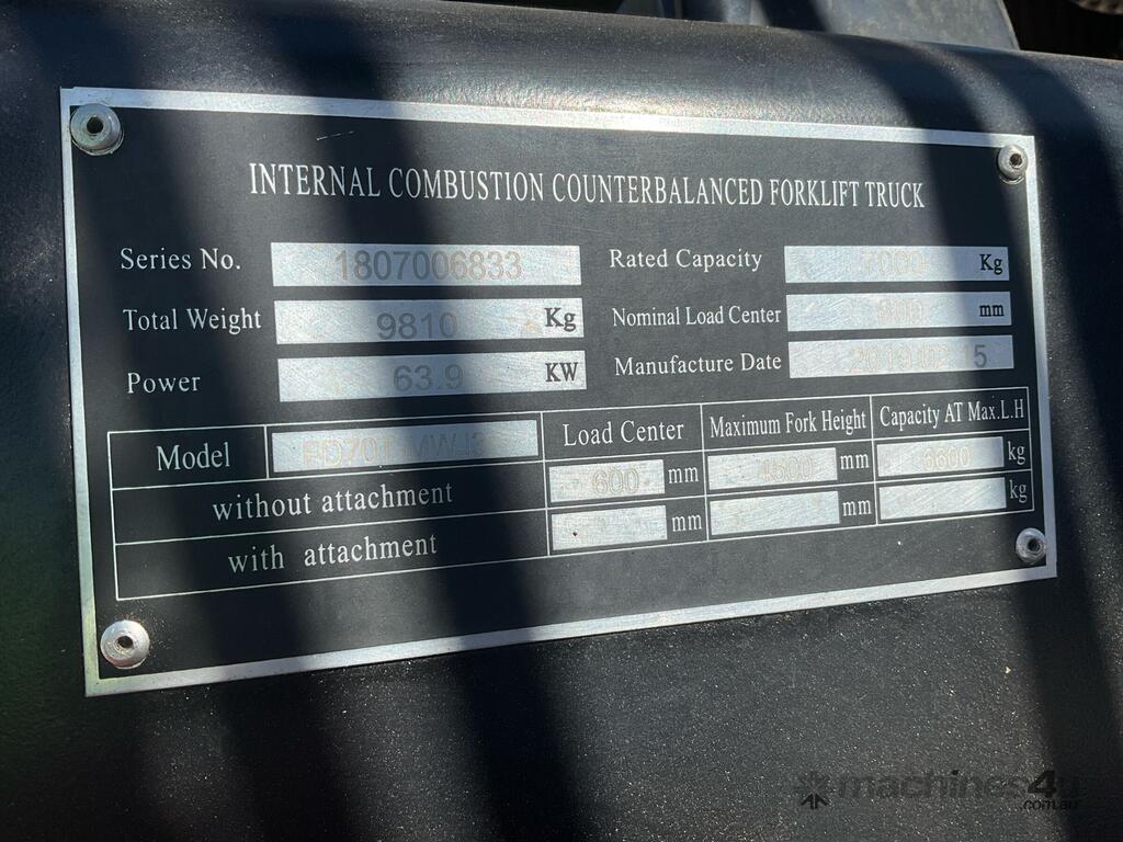 No C/P,Built: 02/2019,Enforcer,FD70T,Forklift,6 Cyl,Diesel Turbo,Odometer not visible,536 (Hrs. Showing on Hour meter),Colour: Red,Rego. No: NP(SDO11), Unregistered,Chassis: G60S1800095,Serial No: ,Sold with No Plates