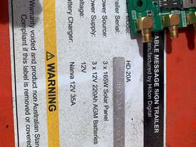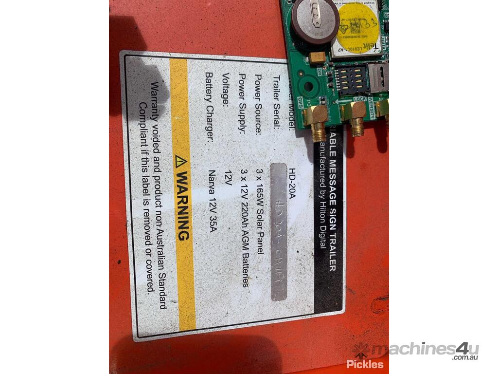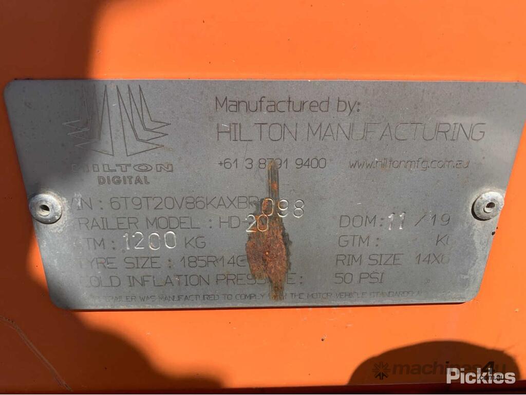 CP: CIRCA 2019,Built: 11/2019,Hilton Manufacturing,HD-20A,Message Board (Trailer Mounted),Hubometer not visible,Colour: Orange,Unregistered TAS,VIN: 6T9T20V86KAXBP098,Serial No: 1228791,Sold with No Plates