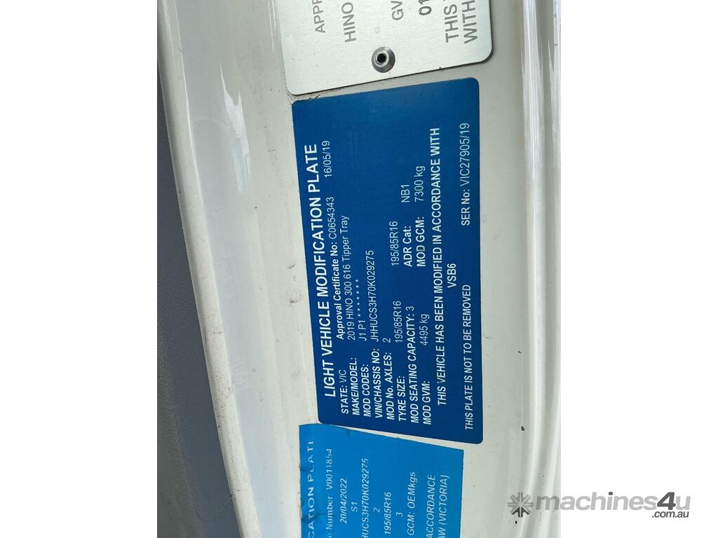 CP: 01/2019,Hino,300 616 ,Tipper,Automatic,Leaf spring,4 Cyl,Diesel,68003 (Kms. Showing on Odometer),Hourmeter not visible,Colour: White,Rego. No: NP(1PD2YN), Unregistered,VIN: JHHUCS3H70K029275,Key No: 163,GVM: 4495,GCM: 7300,Sold with No Plates,Key No: 163