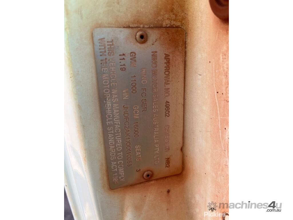CP: 11/2019,Hino,500 SERIES,Garbage Compactor (Side Load),Automatic,Leaf Springs ,4 Cyl,Diesel,65747 (Kms. Showing on Odometer),Hourmeter not visible,Colour: White,Rego. No: CD93AY NT,VIN: JHDFC2AK1XXX10055,GVM: 11000,GCM: 16000,Sold with No Plates