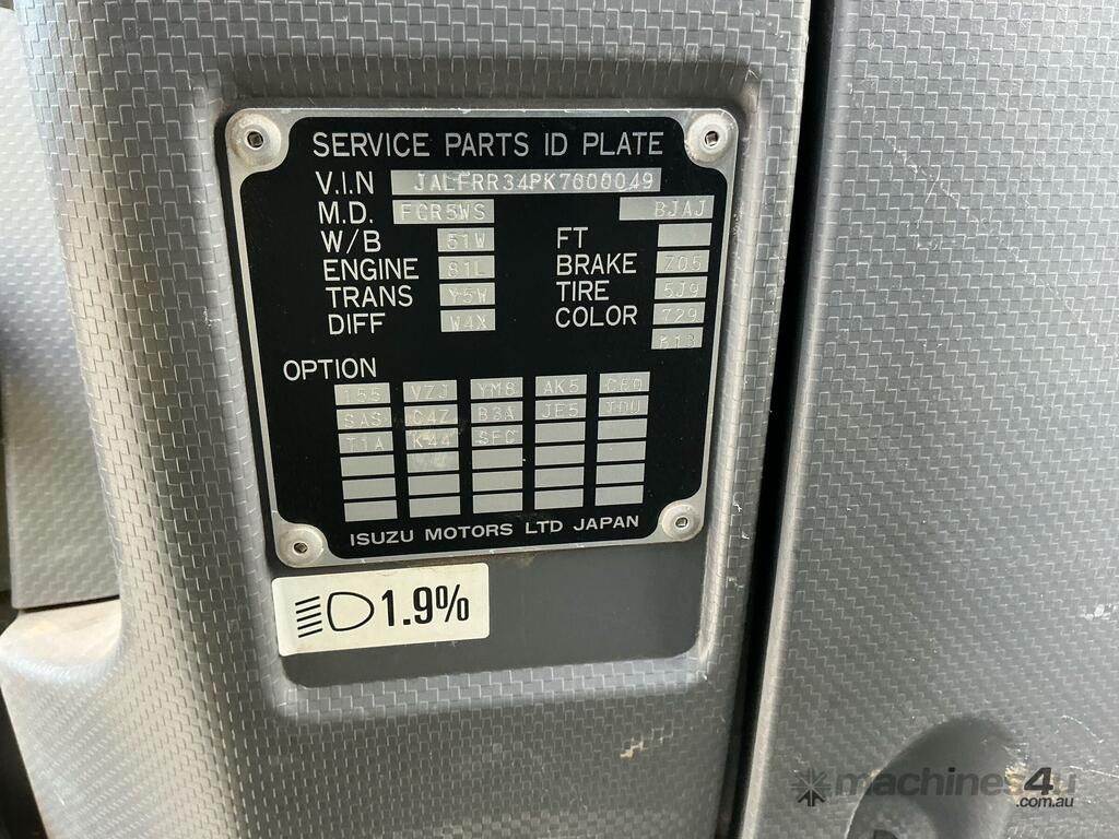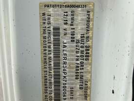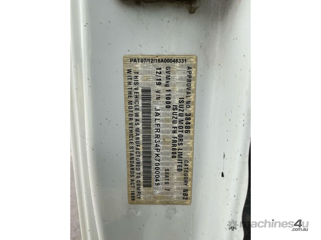 CP: 12/2019,Isuzu,FRR 110-260,Crew Cab Table Top,Automatic,Spring,6 Cyl,Diesel,112440 (Kms. Showing on Odometer),3429 (Hrs. Showing on Hour meter),Colour: White,Rego. No: NP(XQ54JF), Unregistered NAT,VIN: JALFRR34PK7000049,Length: 8.52 m,GVM: 11000,GCM: 20000,Sold with No Plates