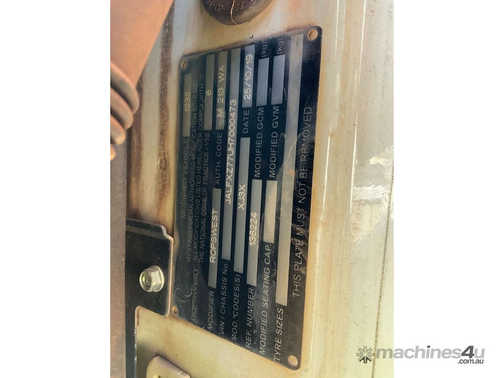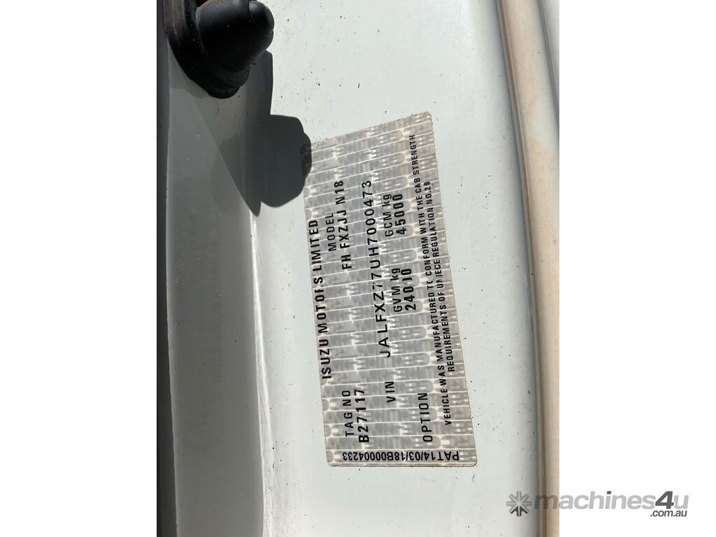 CP: 03/2019,Isuzu,FXZ240-350,Crane Truck (Table Top),Automatic,Leaf Spring Suspension ,6 Cyl,65391 (Kms. Showing on Odometer),1939 (Hrs. Showing on Hour meter),Colour: White,Rego. No: NP(1GYL742), Unregistered WA,VIN: JALFXZ77UH7000473,Key No: 17,GVM: 24000,GCM: 45000,Sold with No Plates,Key No: 17