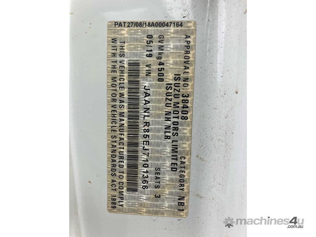 CP: 05/2019,Isuzu,NLR 45-150,Service Body,Automatic,Spring,4 Cyl,Diesel,Turbo,139897 (Kms. Showing on Odometer),3925 (Hrs. Showing on Hour meter),Colour: White,Rego. No: CT51ZX NSW,VIN: JAANLR85EJ7101366,Length: 4.8 m,GVM: 4500,GCM: 8000,Sold with No Plates