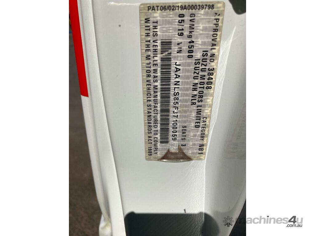 CP: 05/2019,Isuzu,NLS 45-150,Service Body Day Cab,Manual,Leaf Spring Suspension ,4 Cyl,Diesel Turbo,5 Gears,196402 (Kms. Showing on Odometer),3886 (Hrs. Showing on Hour meter),Colour: White,Rego. No: 1GWK546 WA,VIN: JAANLS85FJ7100059,Key No: 262,Length: 5.6 m,GVM: 4500,GCM: 8000,Sold with No Plates,Key No: 262