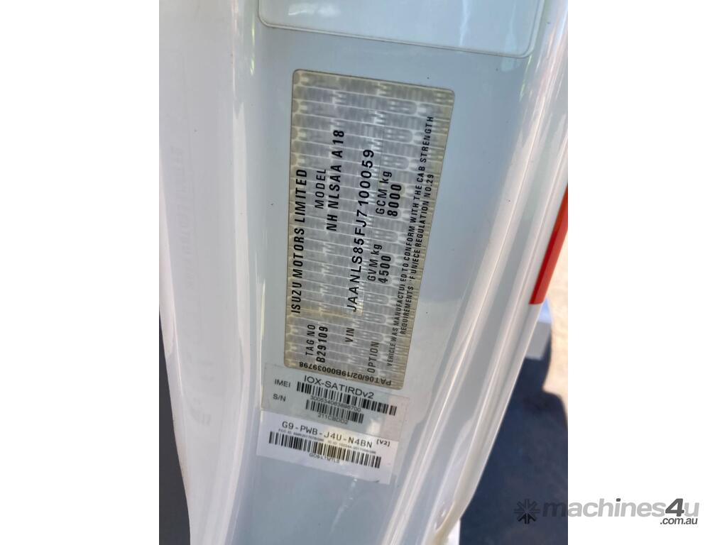 CP: 05/2019,Isuzu,NLS 45-150,Service Body,Manual,Leaf Spring Suspension ,4 Cyl,Diesel Turbo,5 Gears,196402 (Kms. Showing on Odometer),3886 (Hrs. Showing on Hour meter),Colour: White,Rego. No: NP(1GWK546), Unregistered WA,VIN: JAANLS85FJ7100059,Key No: 262,Length: 5.6 m,GVM: 4500,GCM: 8000,Sold with No Plates,Key No: 262