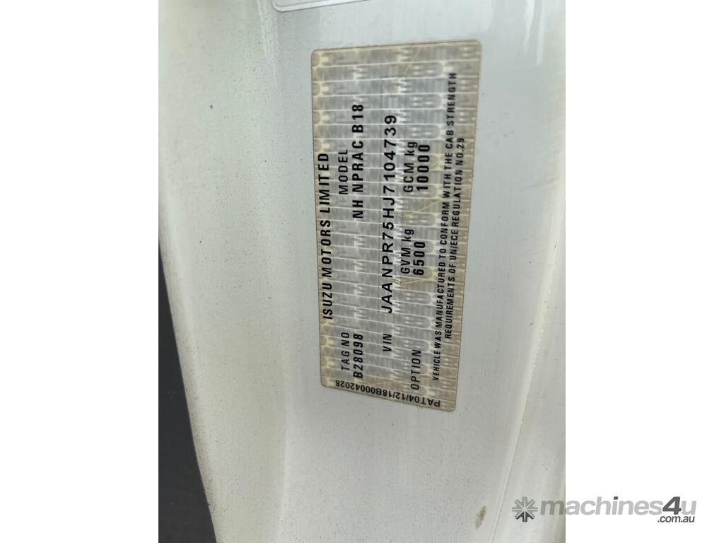 CP: 08/2019,Isuzu,NPR 65 190,Service Body Day Cab,Manual,Spring Suspension,4 Cyl,Diesel,6 Gears,131338 (Kms. Showing on Odometer),2854 (Hrs. Showing on Hour meter),Colour: White,Rego. No: NP(XV39IG), Unregistered NAT,VIN: JAANPR75HJ7104739,GVM: 6500,GCM: 10000,Sold with No Plates