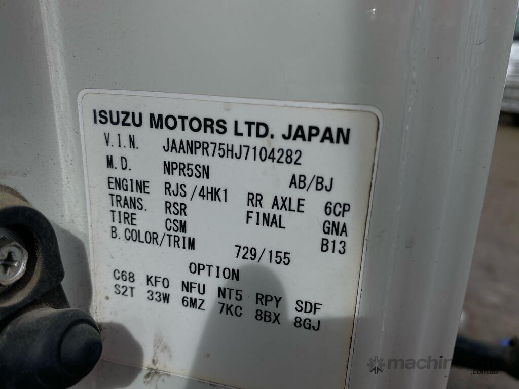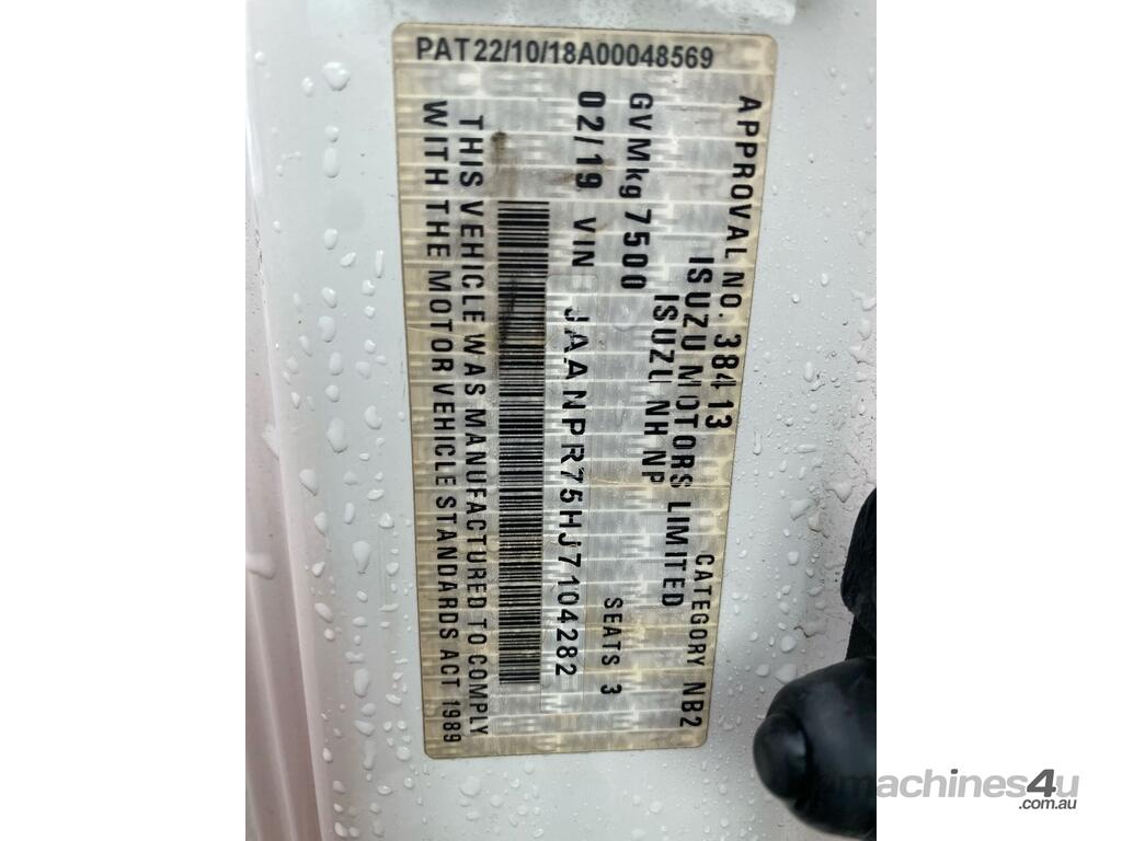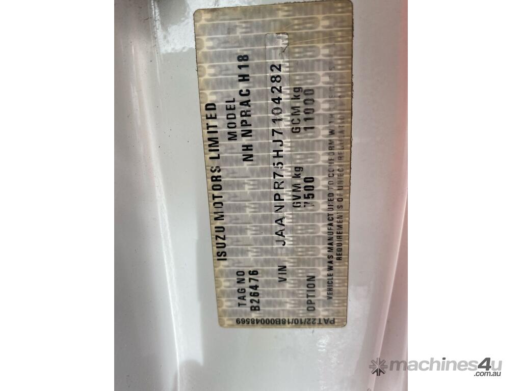 CP: 02/2019,Isuzu,NPR 75-190,Service Body,Manual,Spring,4 Cyl,Diesel,Turbo,6 Gears,Odometer not visible,Hourmeter not visible,Colour: White,Rego. No: NP(XN70IX), Unregistered NSW,VIN: JAANPR75HJ7104282,Length: 15 ft,GVM: 7500,GCM: 11000,Sold with No Plates,WOVR Status: Repairable Write-Off,Incident Type: Impact