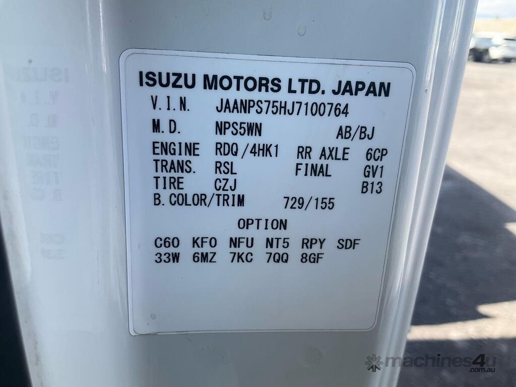 CP: 02/2019,Isuzu,NPS 75-155,Crew Cab Service Body,Automatic,Spring,Engine #: 4HK1781707,4HK1,4 Cyl,Diesel Turbo,247247 (Kms. Showing on Odometer),7508 (Hrs. Showing on Hour meter),Colour: White,Rego. No: NP(XN72IX), Unregistered NAT,VIN: JAANPS75HJ7100764,Key No: 110,Length: 6.9 m,GVM: 7500,GCM: 11000,Sold with No Plates,Key No: 110