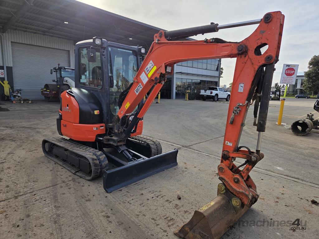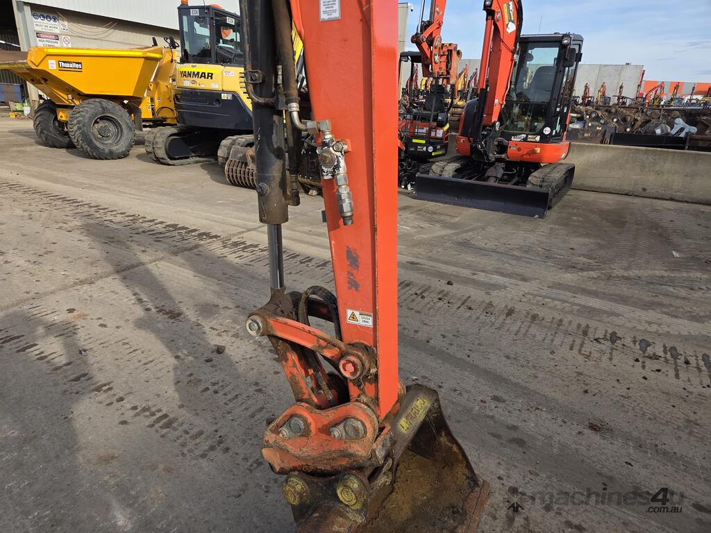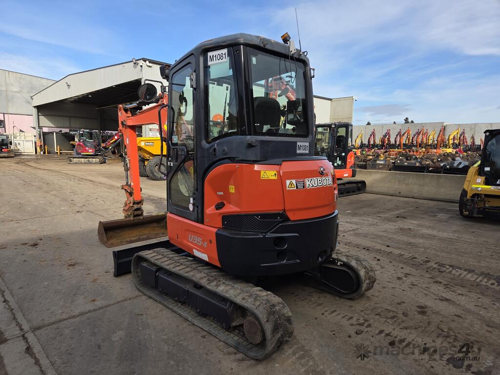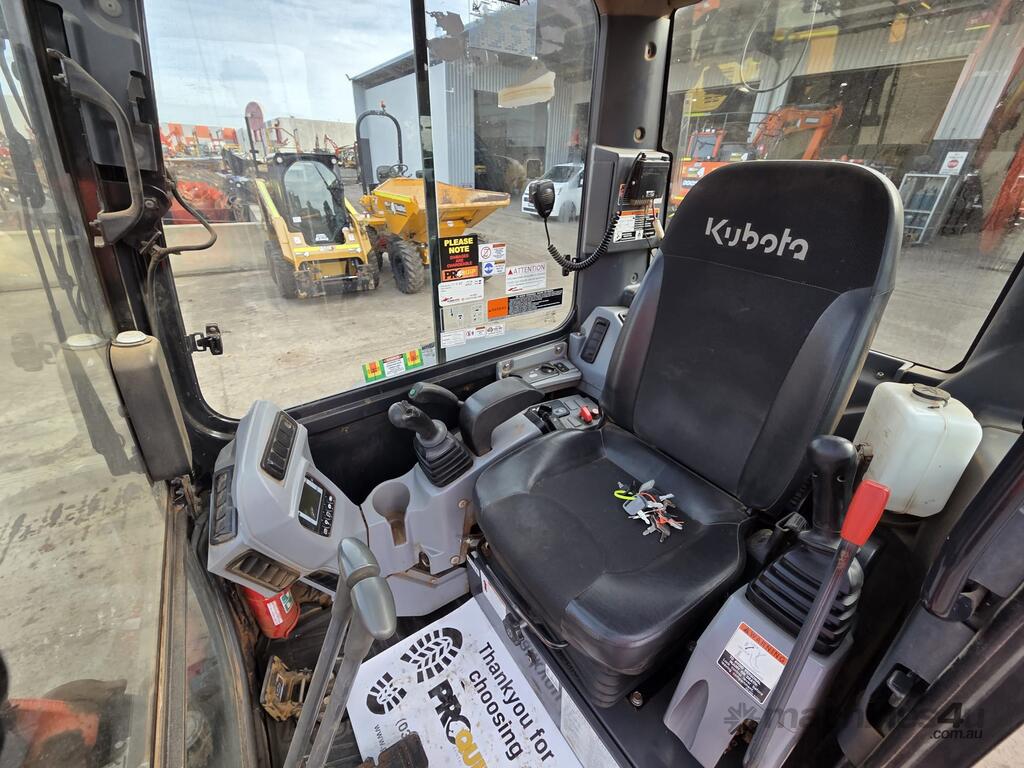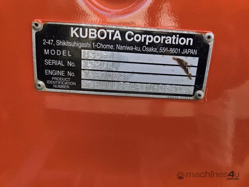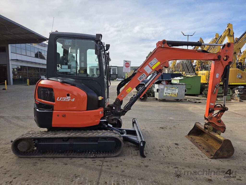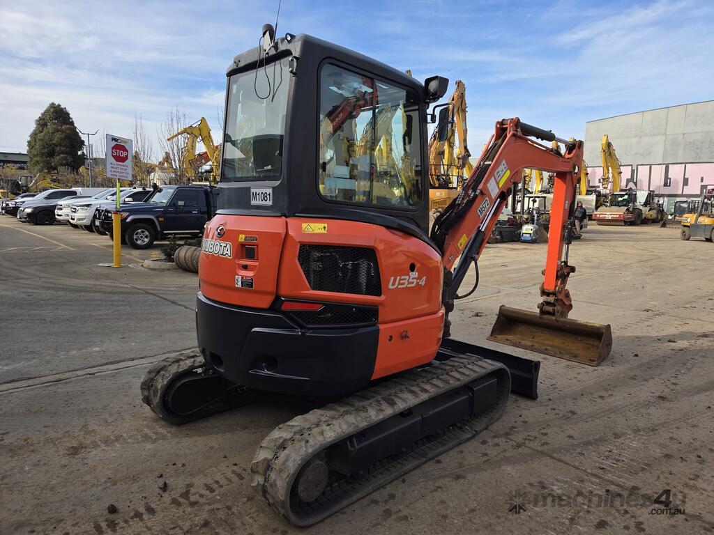 2019 KUBOTA U35-4 ZERO TAIL 3.6T EXCAVATOR WITH FULL A/C CABIN, ROPS, 2035 HRS, 2 SPEED, RUBBER TRACKS, DOZER BLADE, HYDRAULIC HITCH, PROPORTIONAL CONTROL AUXILIARY HAMMER AND AUGER PIPING, 300 & 450mm DIGGING BUCKETS, MUD BUCKET, FIRE EXTINGUISHER AND RISK ASSESSMENT. UHF RADIO, E-STOPS, CIVIL SPEC, TIDY CONDITION, FULLY SERVICED AND READY FOR WORK. ONE OWNER, 3 MONTH DRIVETRAIN WARRANTY.