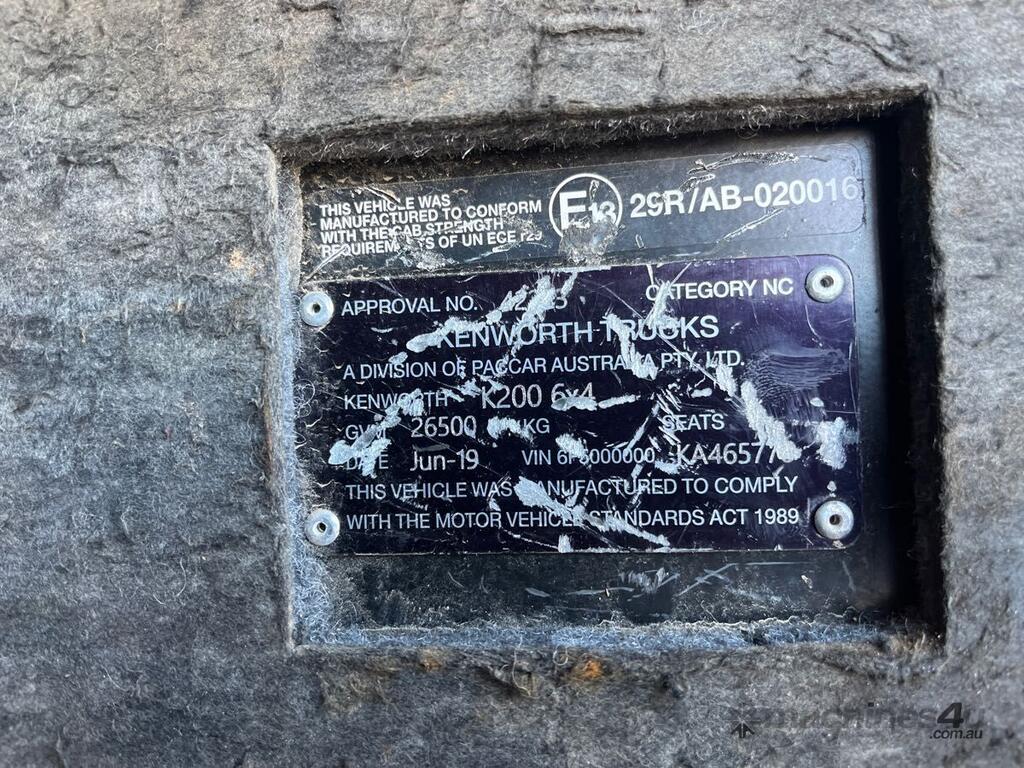 CP: 06/2019,Kenworth,K200 Series,Prime Mover Sleeper Cab,Automatic,Airbag,Cummins ISX,6 Cyl,Diesel Turbo,18 Gears,88863 (Kms. Showing on Odometer),16297 (Hrs. Showing on Hour meter),Colour: Brown,Unregistered,VIN: 6F5000000KA465776,Key No: P33,Length: 6.9 m,GVM: 26500,GCM: 130000,Sold with No Plates,Key No: P33