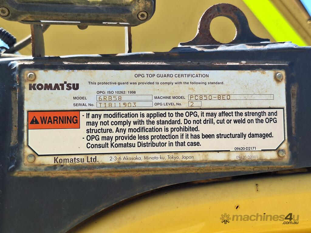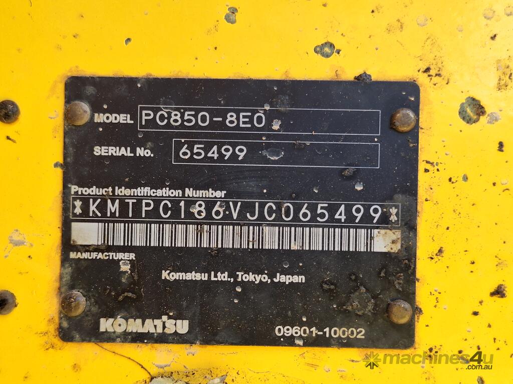 CP: CIRCA 2019,Komatsu,PC850-8,Excavator (Steel Tracked),Engine #: 542132,6 Cyl,Diesel,Turbo,Odometer not visible,9542 (Hrs. Showing on Hour meter),Colour: Yellow,Unregistered,Serial No: KMTPC186VJC065499,ROPS No: undefined,Sold with No Plates