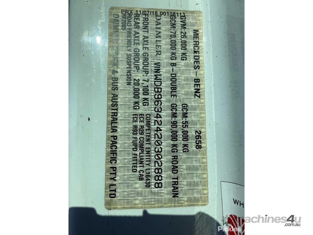 CP: 01/2019,Mercedes Benz,Actros 2658,Prime Mover Sleeper Cab,Automatic,Airbag,6 Cyl,Diesel Turbo,464370 (Kms. Showing on Odometer),11701 (Hrs. Showing on Hour meter),Colour: White,Rego. No: NP(XV30DL), Unregistered VIC,VIN: WDB2888,Key No: 106E,Length: 7 m,GVM: 26000,GCM: 90000,Sold with No Plates,Key No: 106E